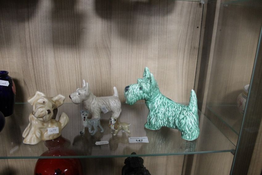 THREE SYLVAC DOGS AND TWO WADE FIGURES