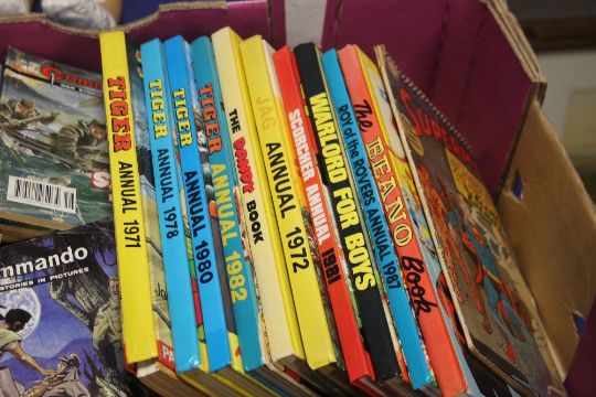 A TRAY OF PICTURE LIBRARY BOOKS TOGETHER WITH ANNUALS AND COMICS