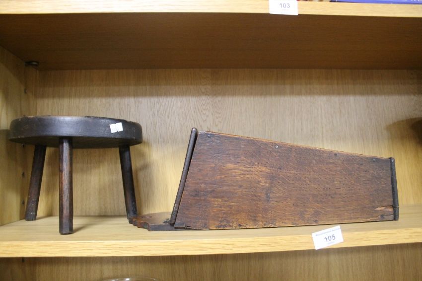 AN ANTIQUE OAK CANDLE BOX AND A MILKING STOOL