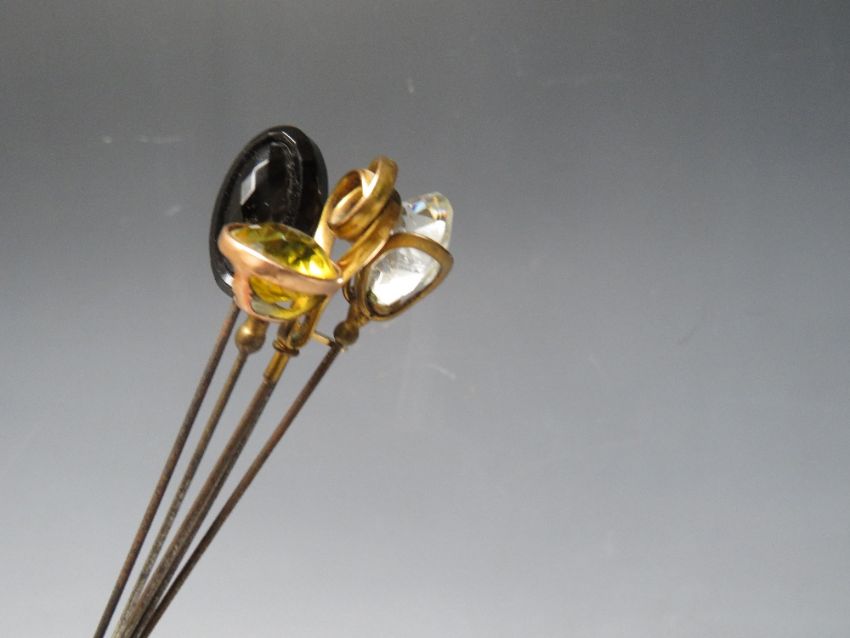 A COLLECTION OF VINTAGE HAIR ACCESSORIES, comprising five assorted hat pins, including a 15ct gold topped example with engraved initials plus a selection of combs