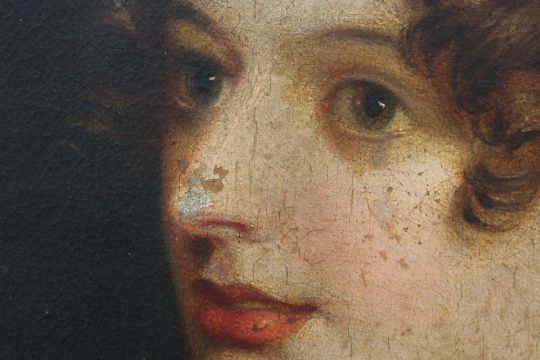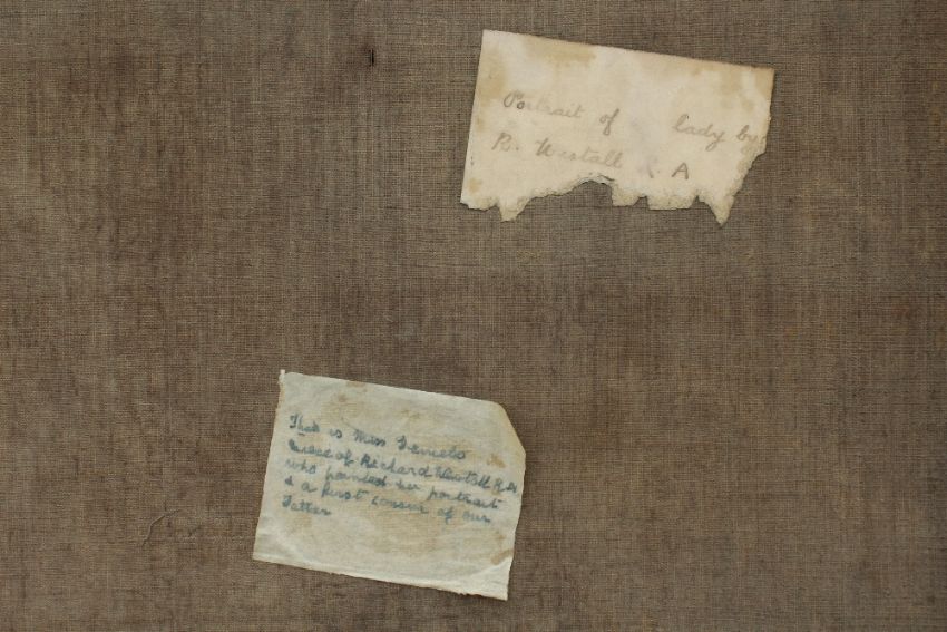CIRCLE OF RICHARD WESTALL R.A. (1765-1836). Portrait of a lady in a white dress with red shawl, possibly Miss Daniels, half- length, oil on canvas, unframed, bearing labels verso, 76 x 63 cm
