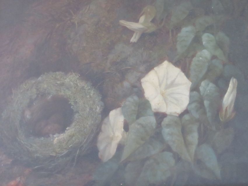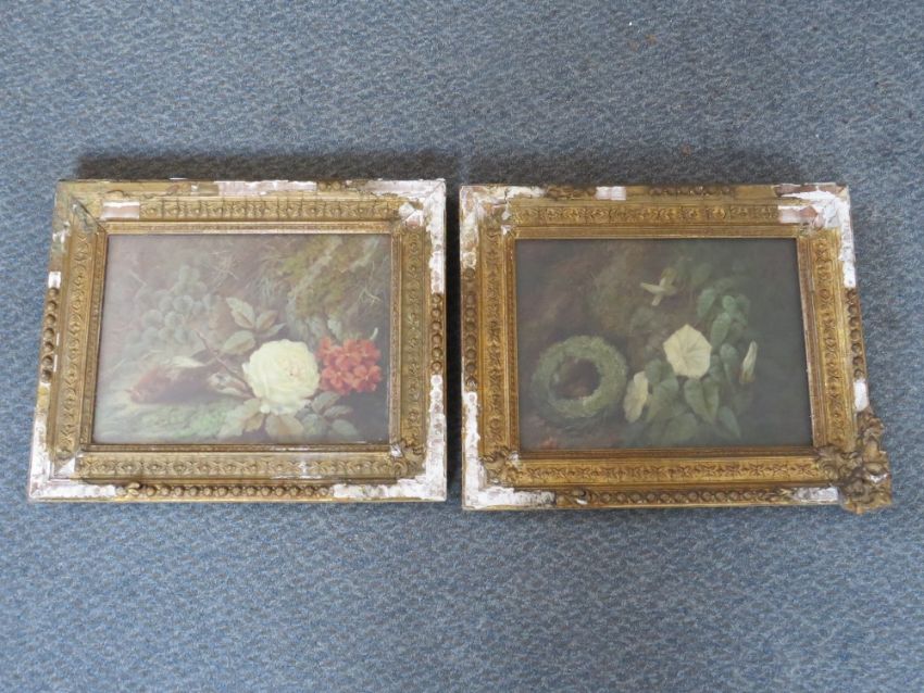 (XIX). A pair of sill life studies- a birds nest and flowers on a mossy bank and flowers, plus a dead bird on a mossy bank, one indistinctly signed and dated lower left, oils on canvas, framed and glazed, 21 x 29 cm