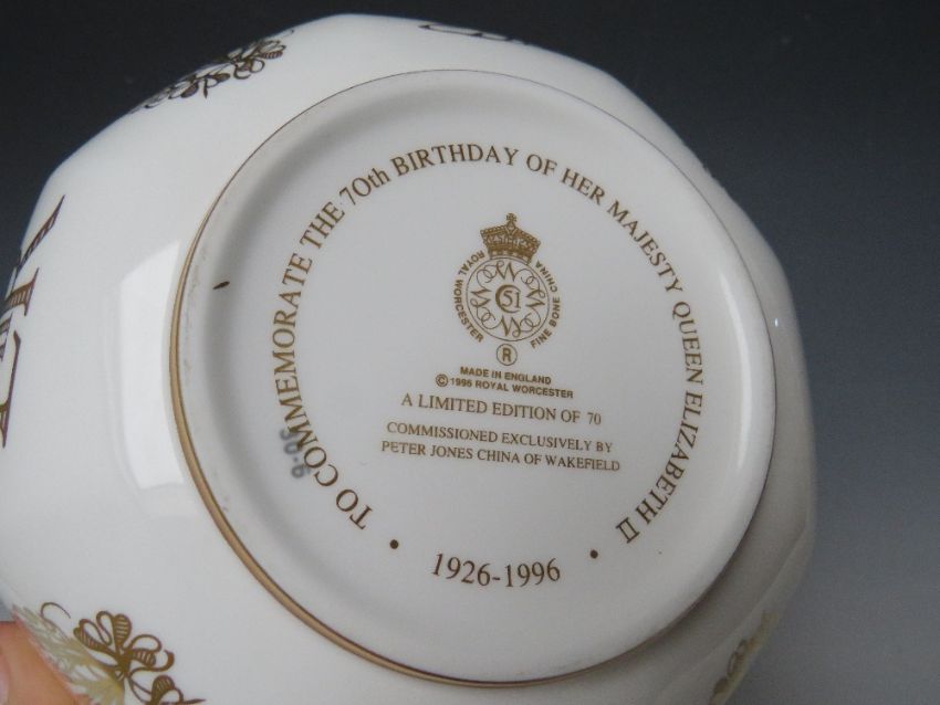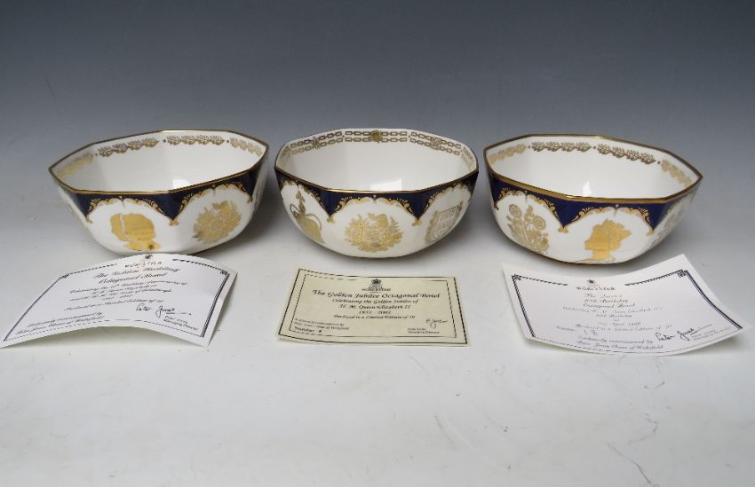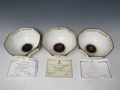 A COLLECTION OF THREE ROYAL WORCESTER COMMEMORATIVE OCTAGONAL BOWLS, celebrating the Golden Jubilee No 5/50, the Golden Wedding No 45/50 and The Queens 70th Birthday No 18/70 (3)