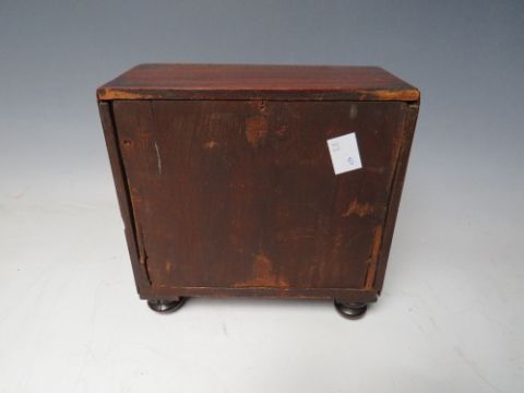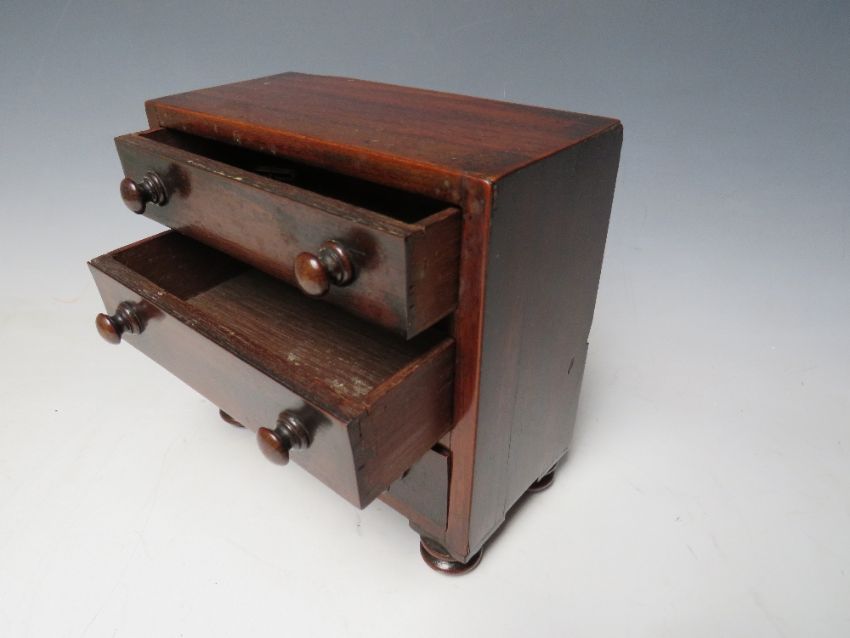 A 19TH CENTURY MINIATURE MAHOGANY THREE DRAWER CHEST, raised on four turned feet, H 17 cm W 18 cm