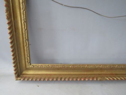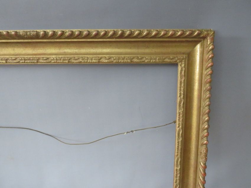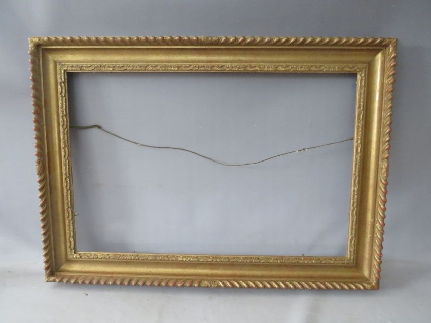 AN EARLY TO MID CENTURY GOLD FRAME WITH DESIGN TO INNER EDGE, leaf design to outer edge, frame W 8.5 cm, rebate 51 x 77 cm