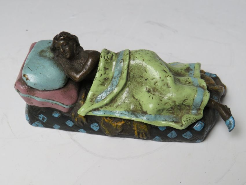 A VINTAGE COLD PAINTED BRONZE FIGURE DEPICTING A NAKED FEMALE UNDER A LOOSE COVER, bearing stamp to the base, L 9.5 cm