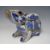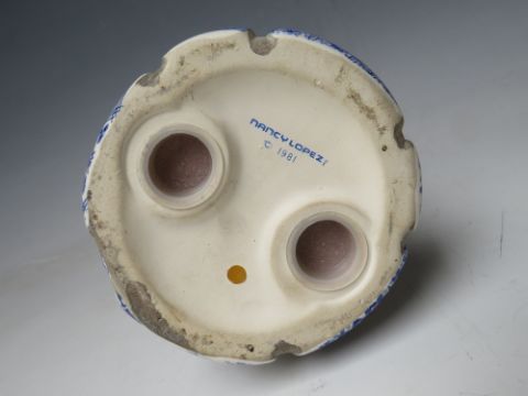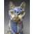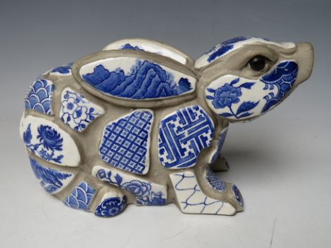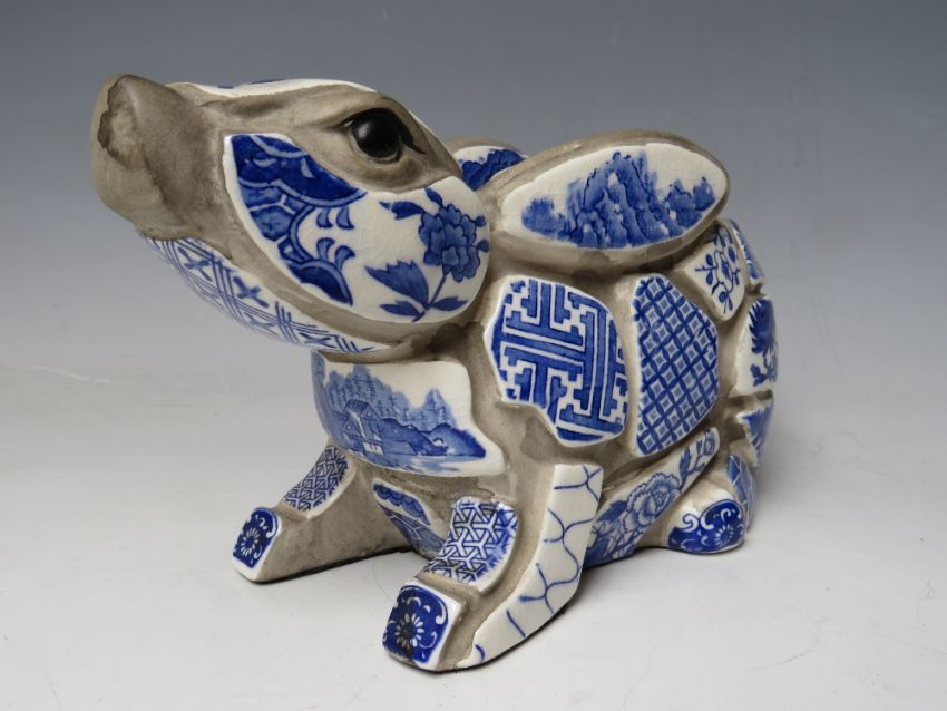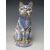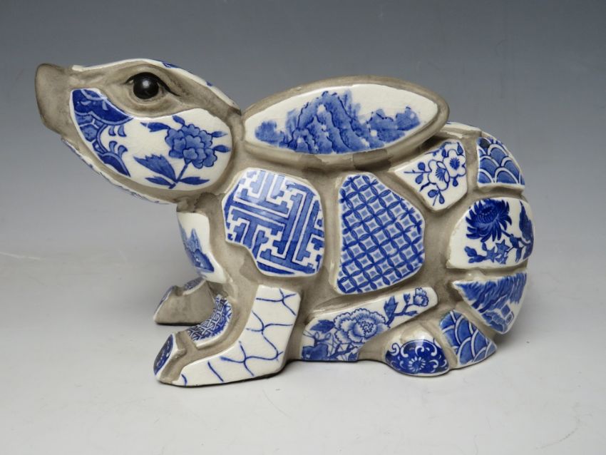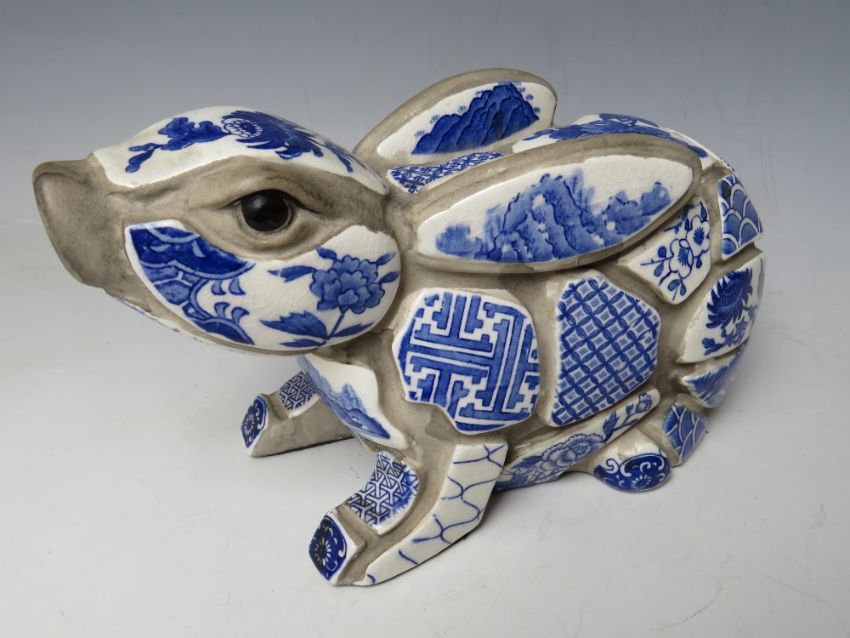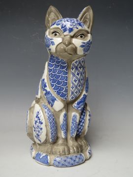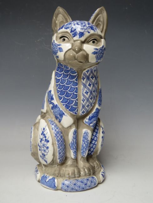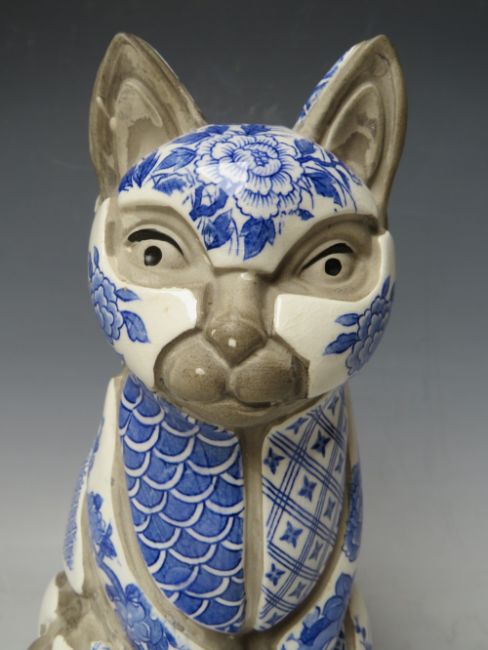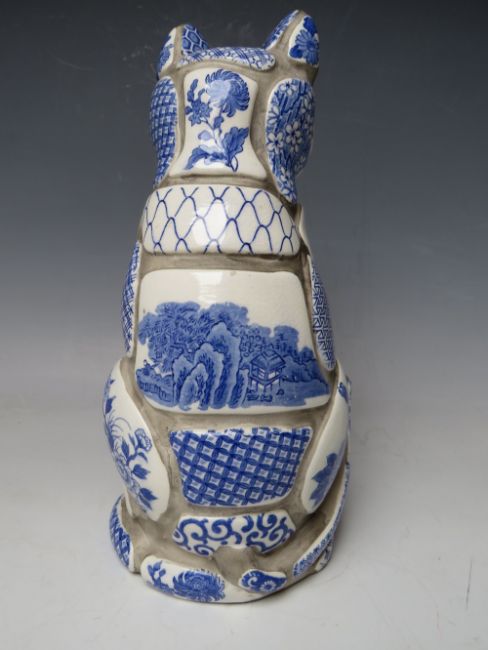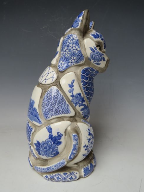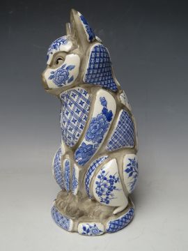 A VINTAGE NANCY LOPEZ BLUE AND WHITE MOSAIC STYLE POTTERY FIGURE OF A SEATED CAT, H 24 cm, together with a similar pottery figure of a rabbit (2)