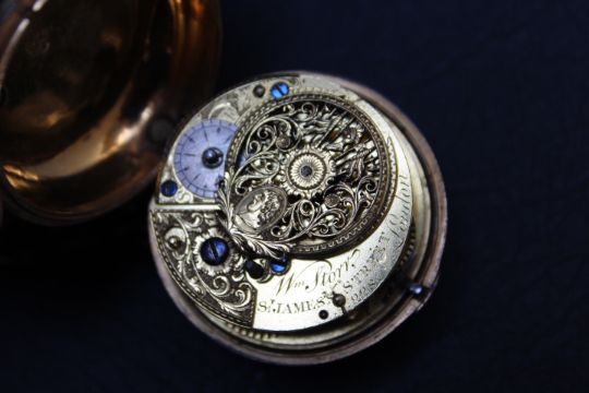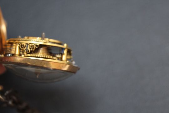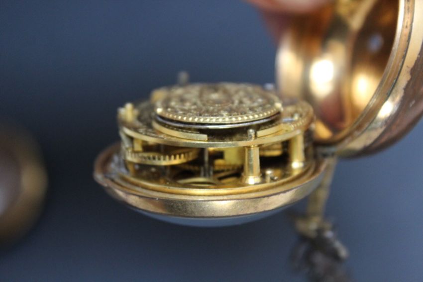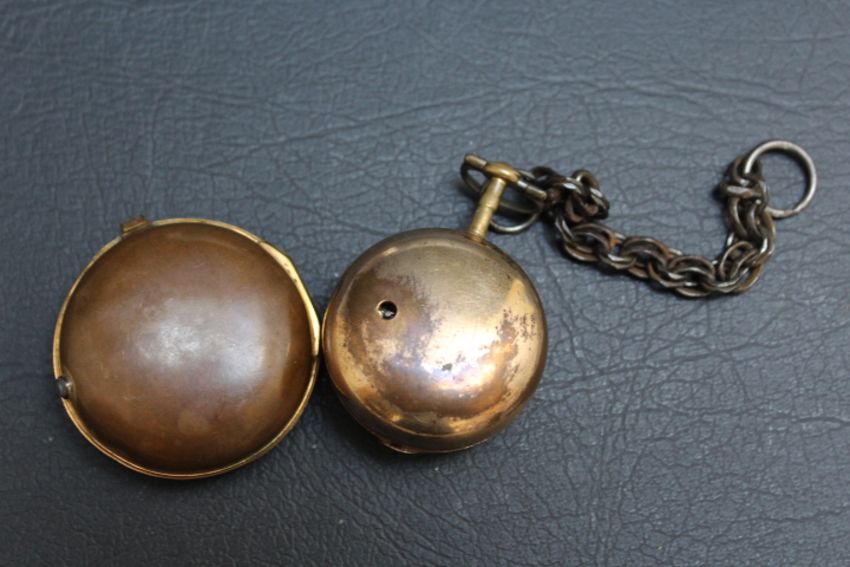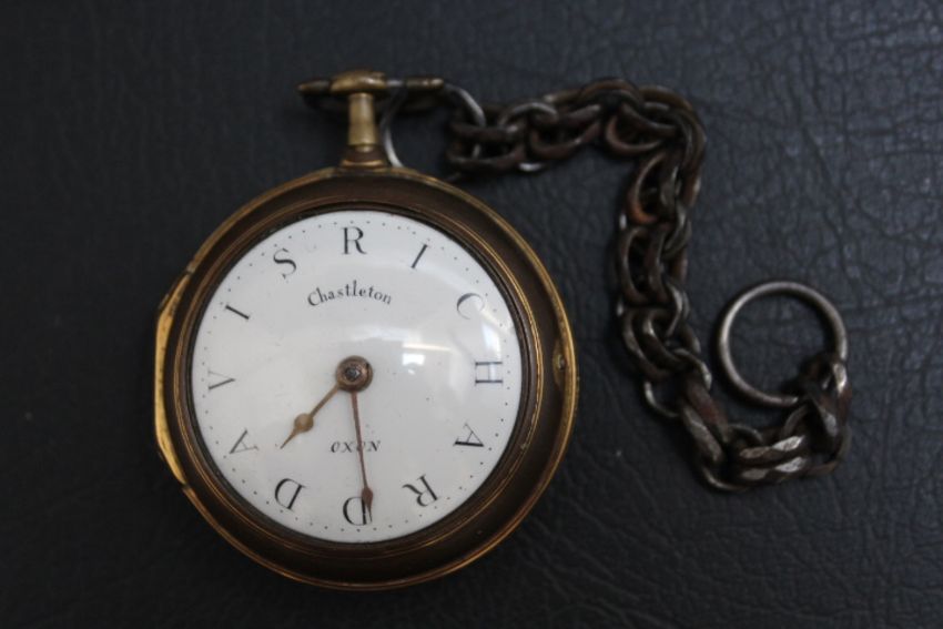 AN UNUSUAL PERSONALISED GEORGIAN PAIR CASED WATCH BY W STOOR OF ST JAMES STREET LONDON - INSTEAD OF NUMBERS THE DIAL READS 'RICHARD HARRIS', with Chastleton Oxon to the centre of the enamel dial, verge movement in brass casings, Dia 5 cm