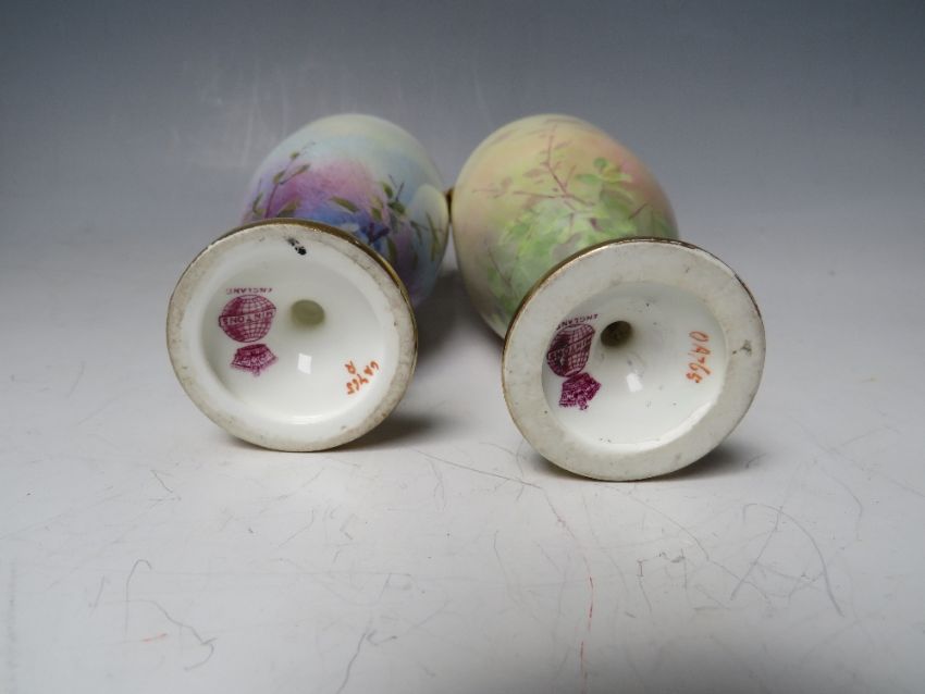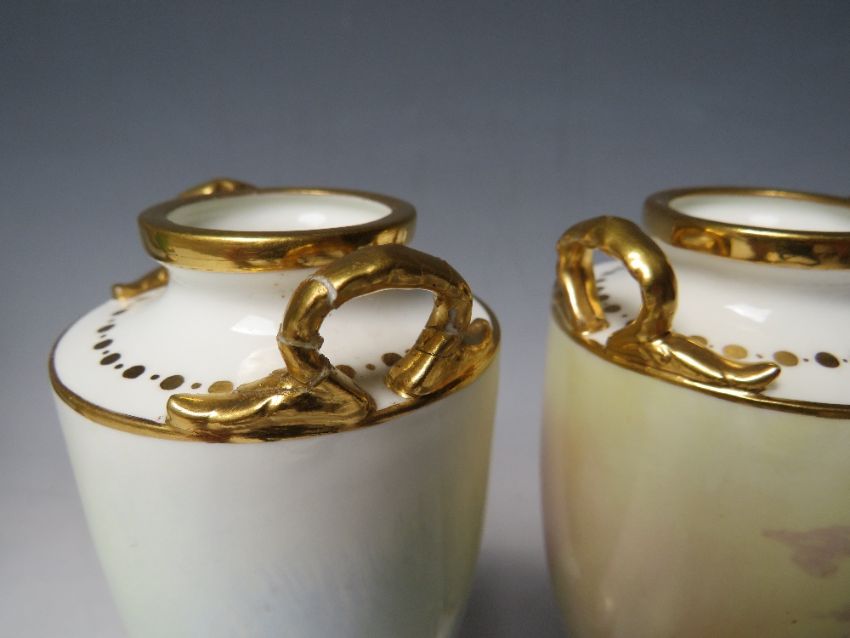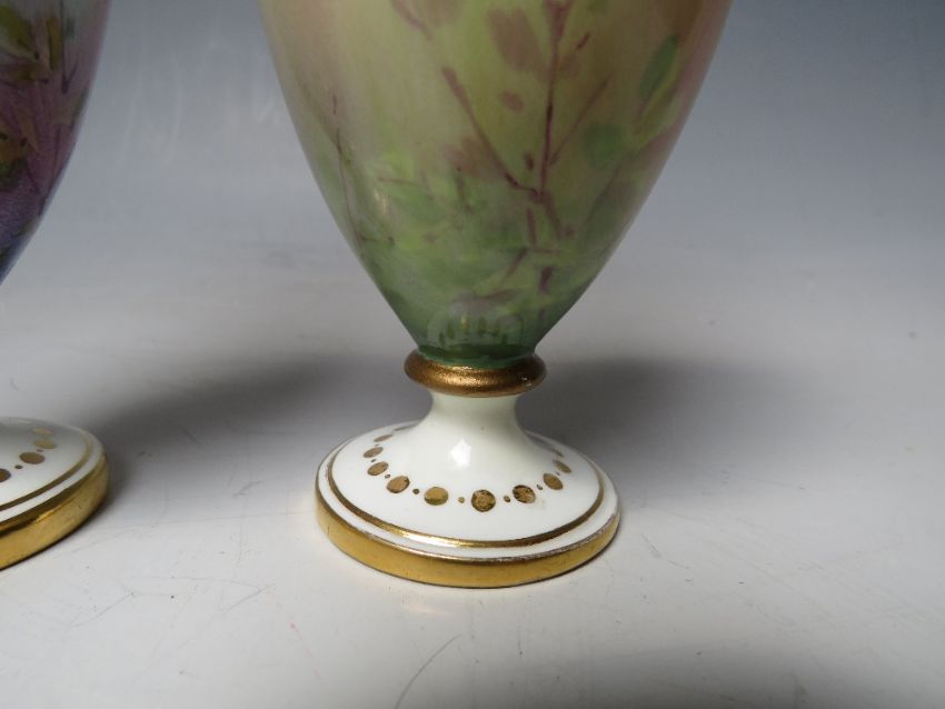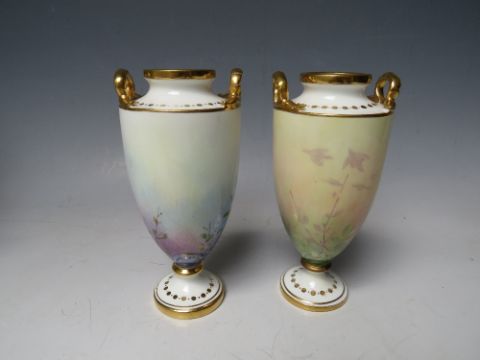 A SMALL PAIR OF MINTONS CABINET VASES, each decorated with game birds, both signed by J E Dean, printed mark to the bases, H 12.3 cm (2) S/D