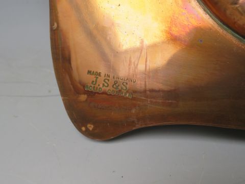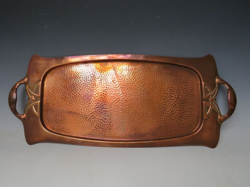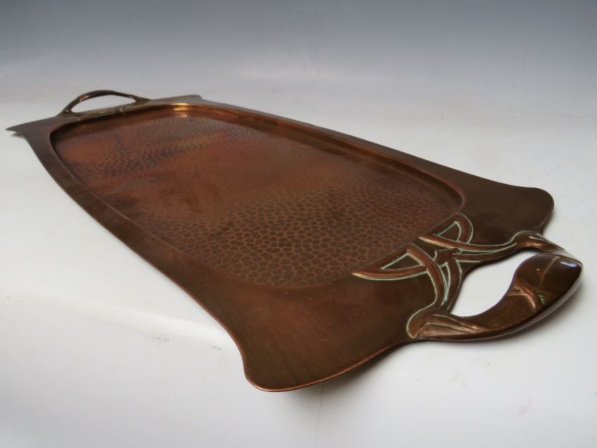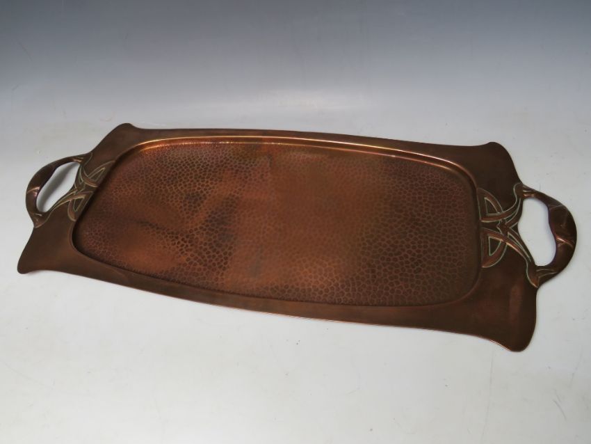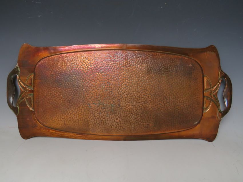 AN ARTS AND CRAFTS HAMMERED COPPER TRAY BY J.S. & S, of oblong form, with stylised Art Nouveau handles, overall L 65 cm
