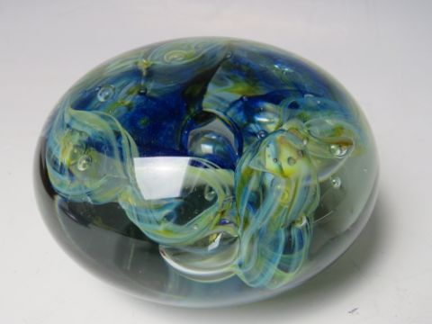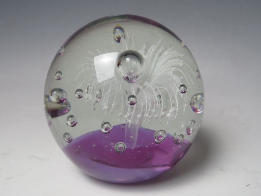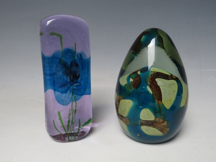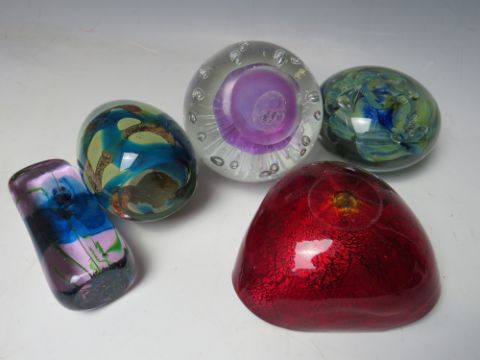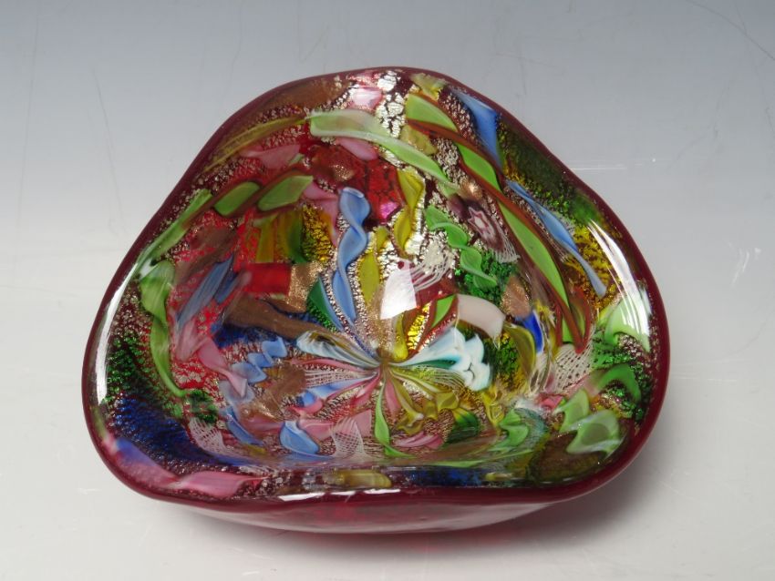 A COLLECTION OF GLASS PAPERWEIGHTS, to include a Mdina and an early Caithness example - H 12.8 cm, together with a Murano 'Tutti-Frutti' style Bizantino triangle shaped bowl by AVEM (5)