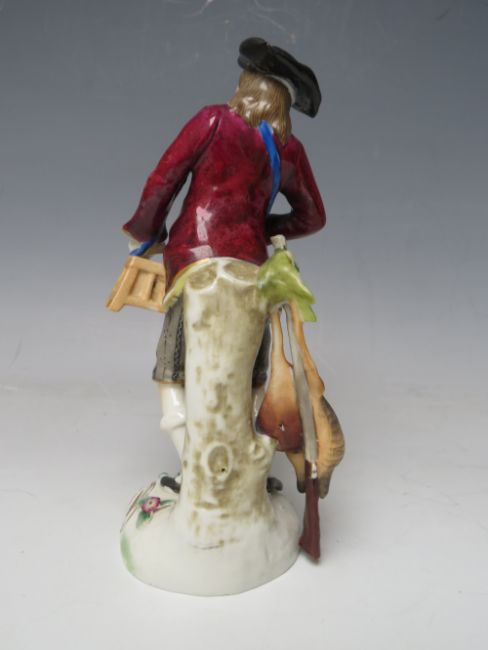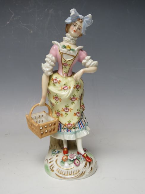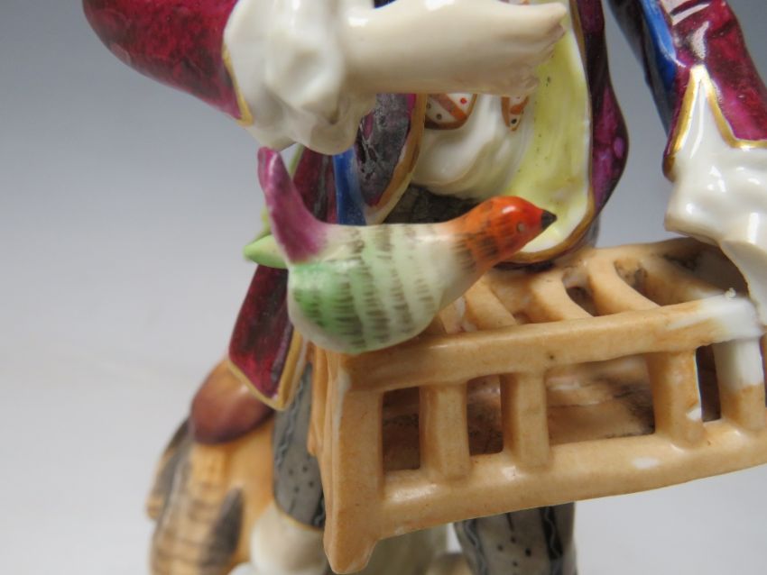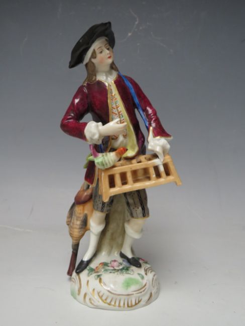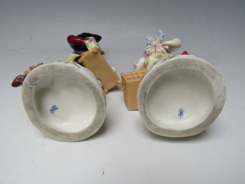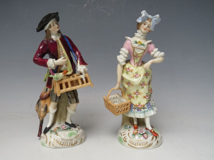 A PAIR OF CONTINENTAL PORCELAIN FIGURINES IN CLASSICAL DRESS, crossed marks to base, tallest H 17.5 cm