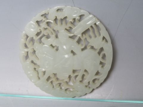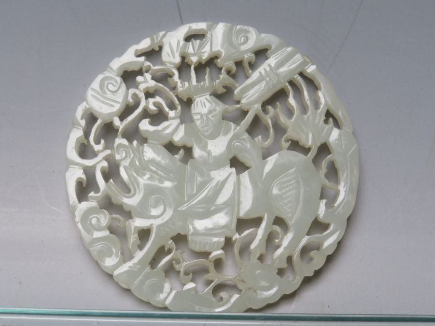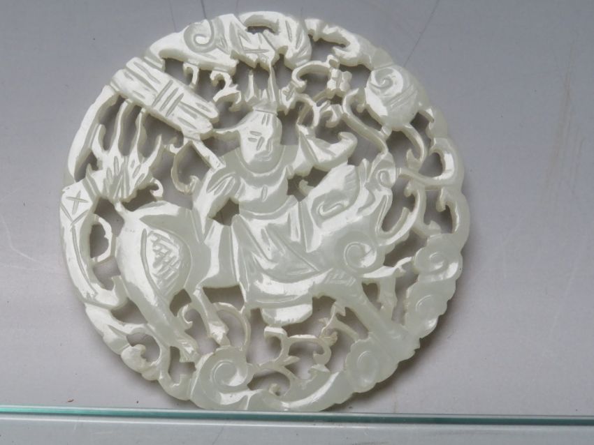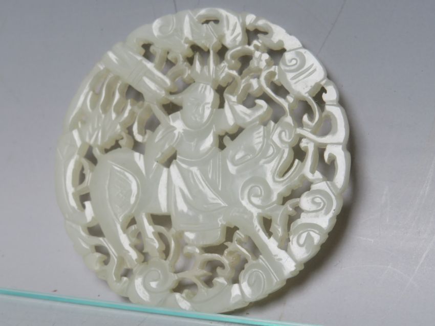 AN ORIENTAL RETICULATED CIRCULAR JADE PANEL, depicting a figure on horseback, Dia. 5.5 cm