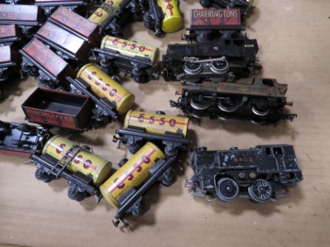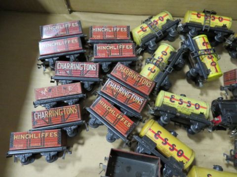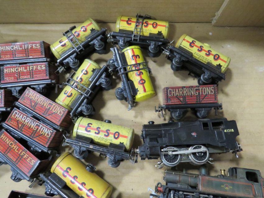 A BOX CONTAINING TRIX MODEL RAILWAY TRUCKS, tankers and three various locomotives