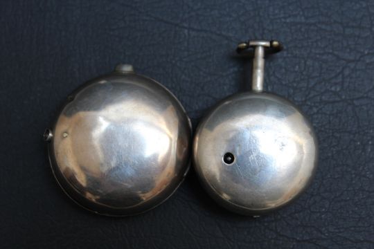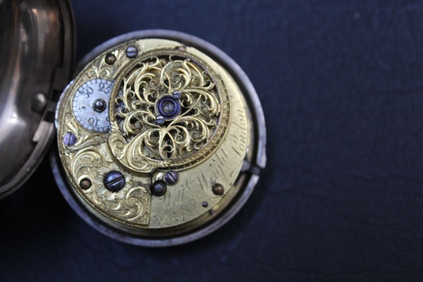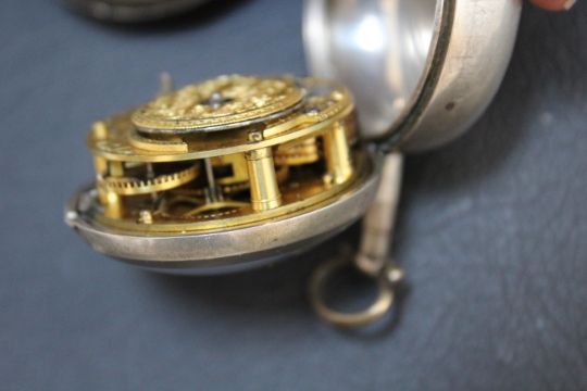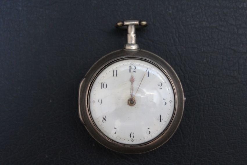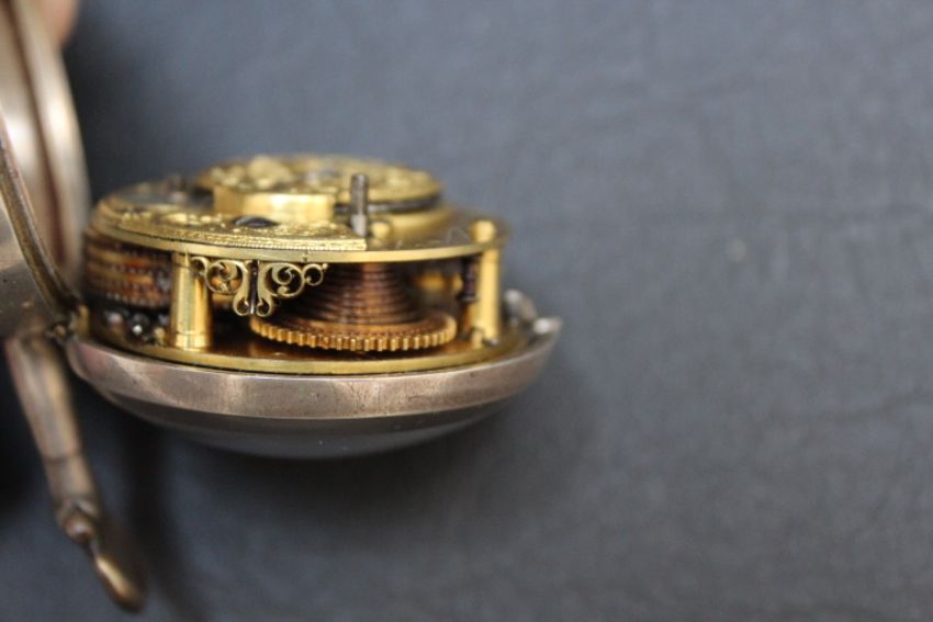 A HALLMARKED SILVER PAIR CASED VERGE POCKET WATCH BY WILLIAM WRIGHT OF LONDON, hallmarks indistinct but probably 1804, on four pillars with intricate foliate scroll, No.134, A/F, Dia 5 cm