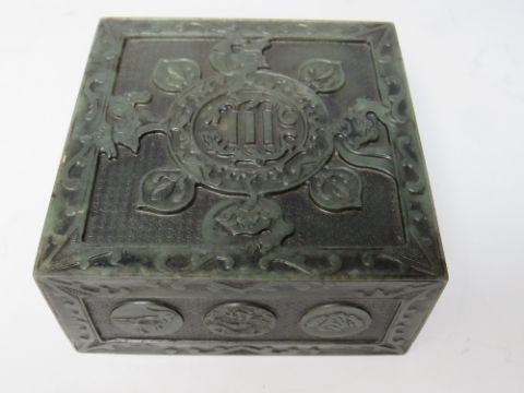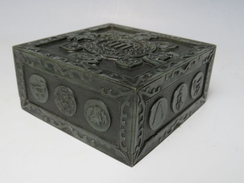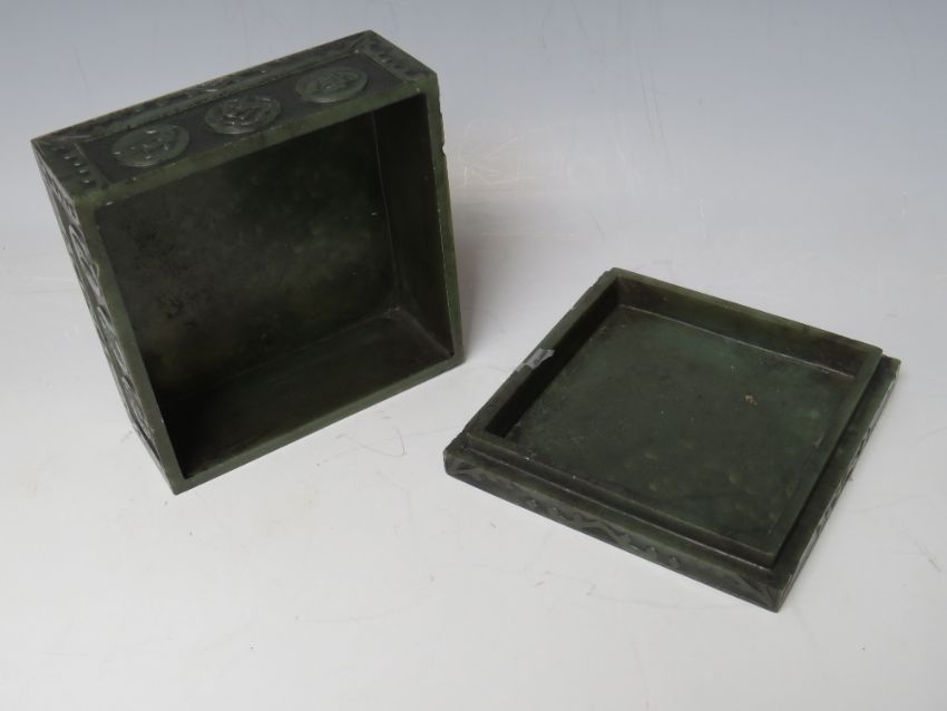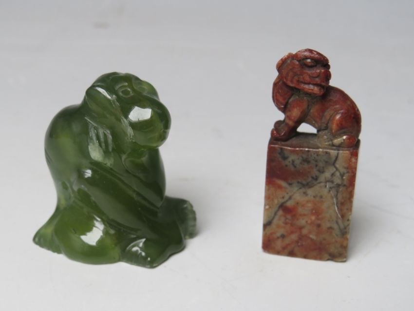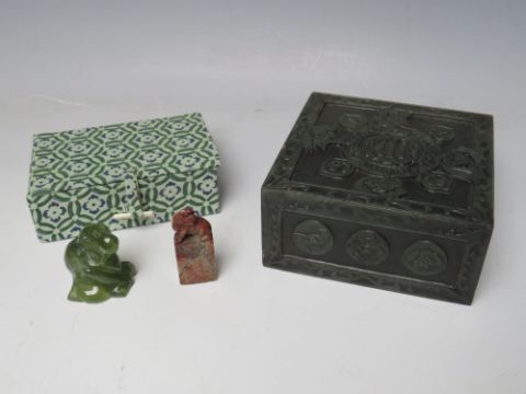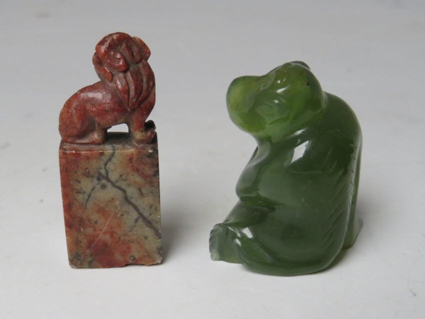 AN ORIENTAL CARVED HARDSTONE LIDDED BOX, approx 10 x 10 x 4.5 cm, together with a carved figure of a monkey and a hardstone seal with Fo dog surmount (3)