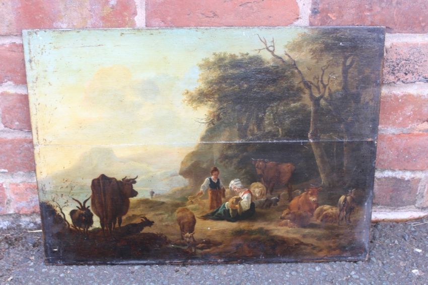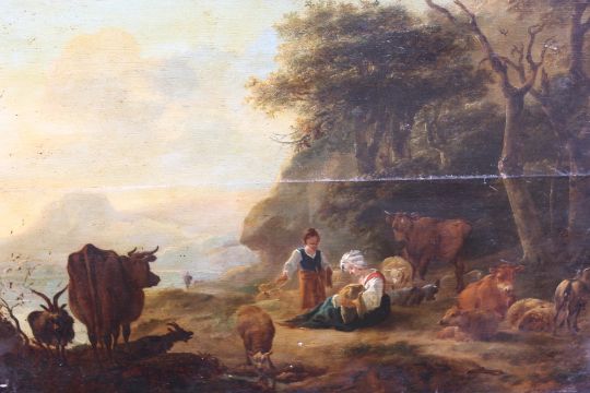 WILLEM ROMEYN (HAARLEM 1624 - c.1694). A shepherdess with her herd in a landscape, oil on panel, unframed, 40.5 x 55.8 cm