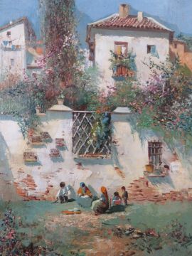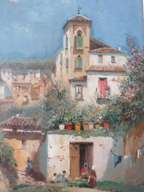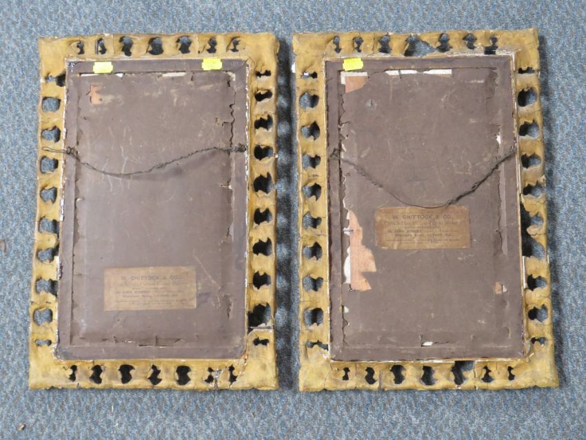 XIX. Italian school, a pair of rural village scenes with figures, indistinctly singed lower right, oils on board, framed in gold Florentine frames, glazed, 30 x 16 cm