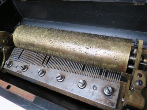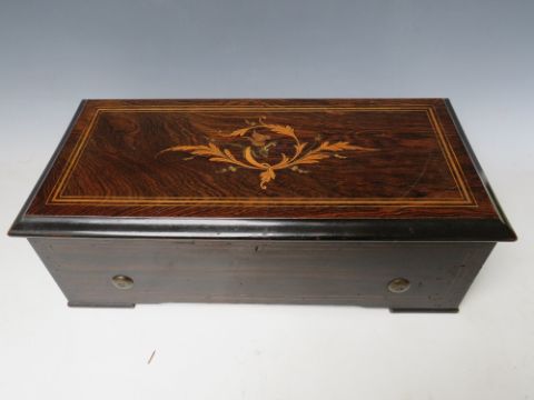 A 19TH CENTURY SWISS MUSIC BOX IN SIMULATED ROSEWOOD CASE, playing six airs, W 43 cm