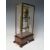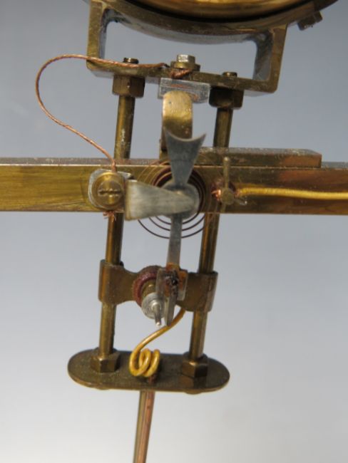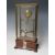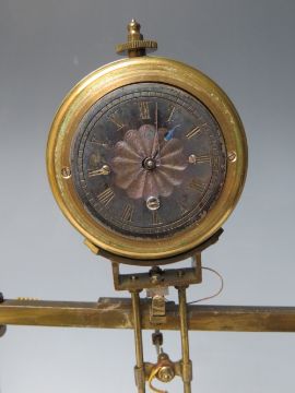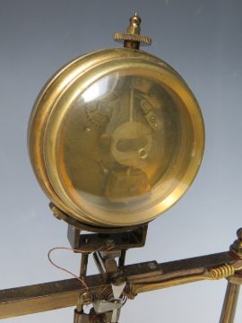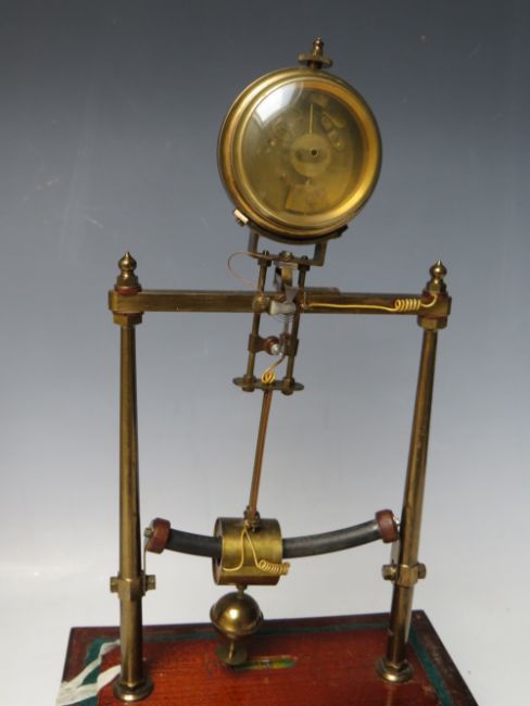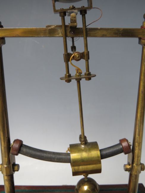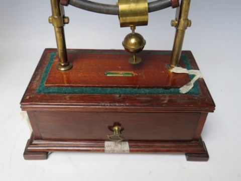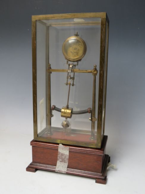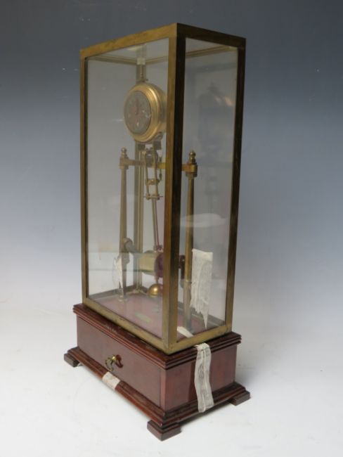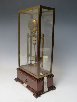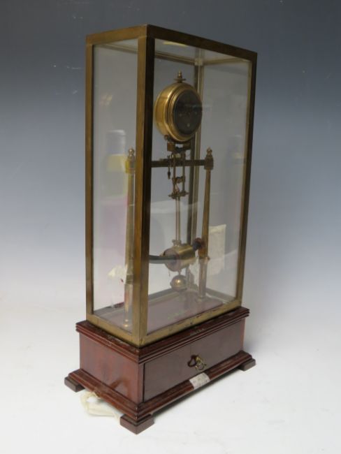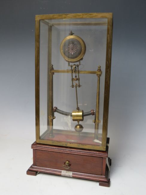 AN EARLY ELECTRIC FOUR GLASS TIMEPIECE, the brass frame supporting a small clock movement and soft iron pendulum bar, mounted on mahogany base with single drawer, overall H 35 cm