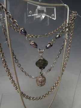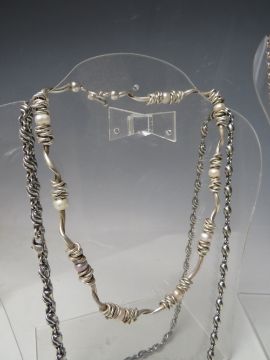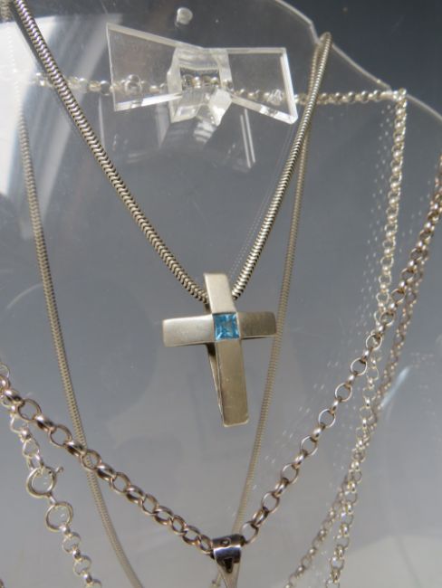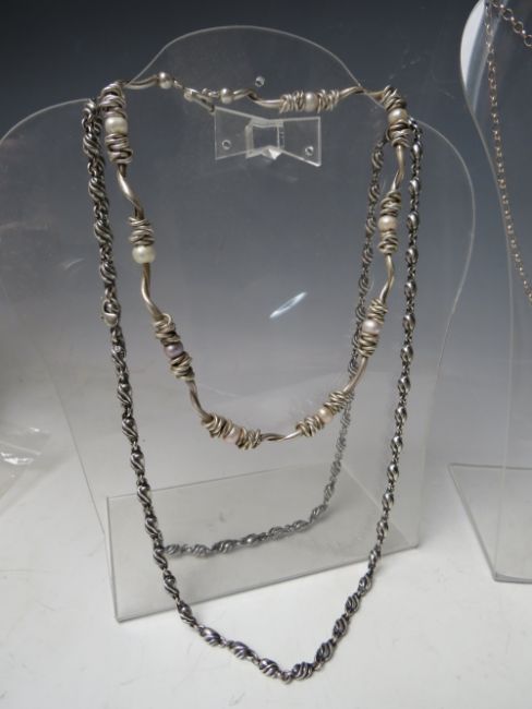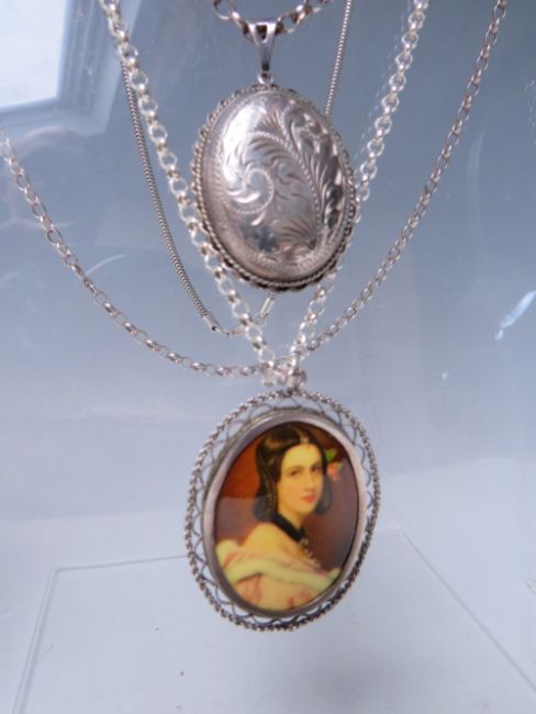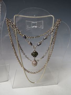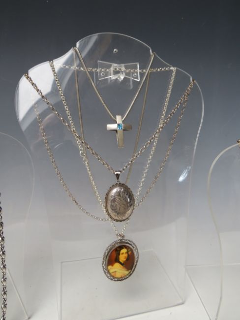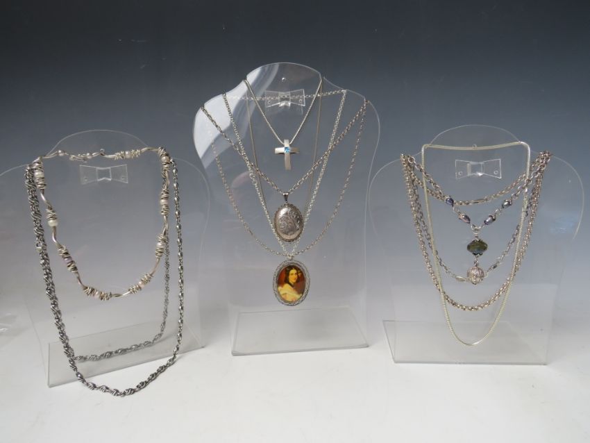 FIVE ASSORTED HALLMARKED AND 925 SILVER NECKLACES, together with a hallmarked silver locket on sterling silver chain, a hallmarked silver portrait pendant and chain, plus and unmarked white metal necklace with filigree dropper and pearl embellishment (8)