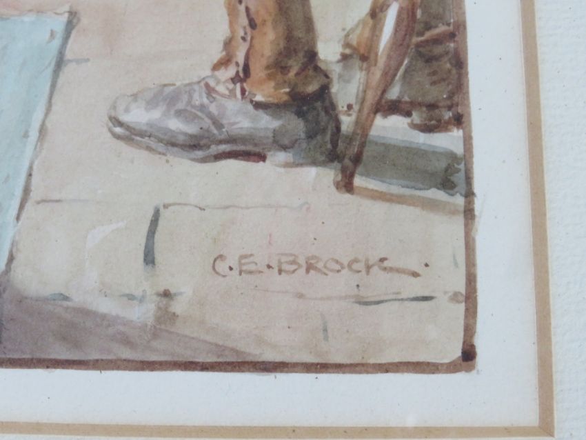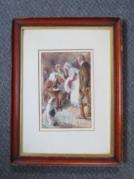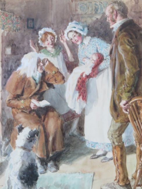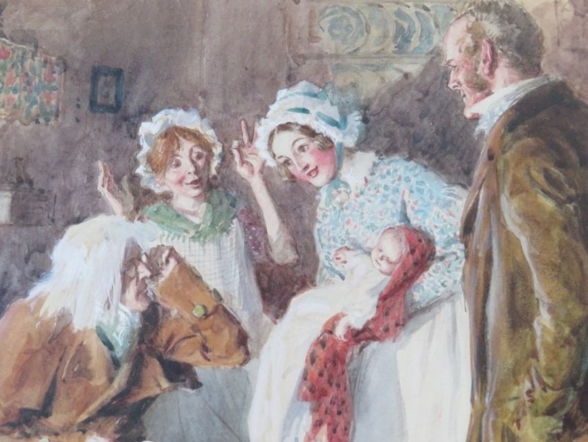 CHARLES EDMUND BROCK (1870-0938). Interior scene with figures, dog and new baby, signed lower right, watercolour, framed and glazed, 24 x 16 cm