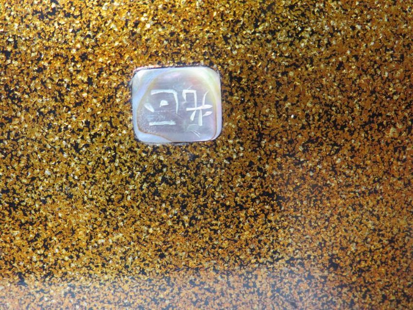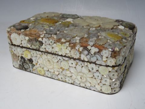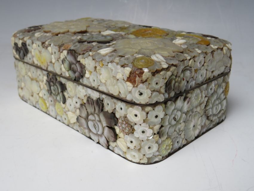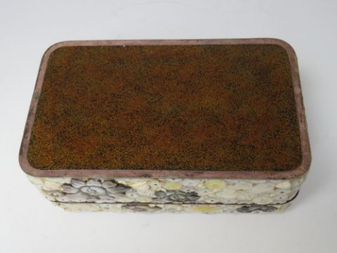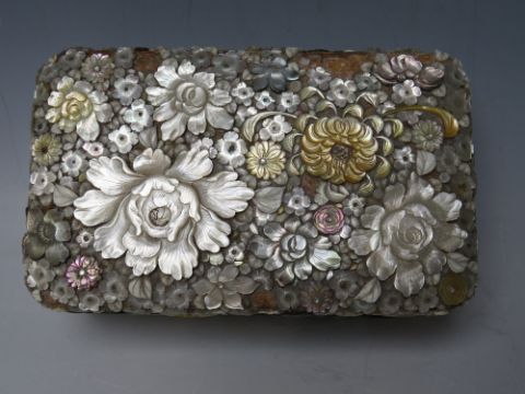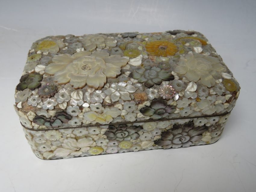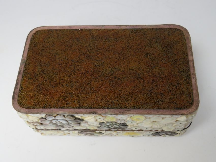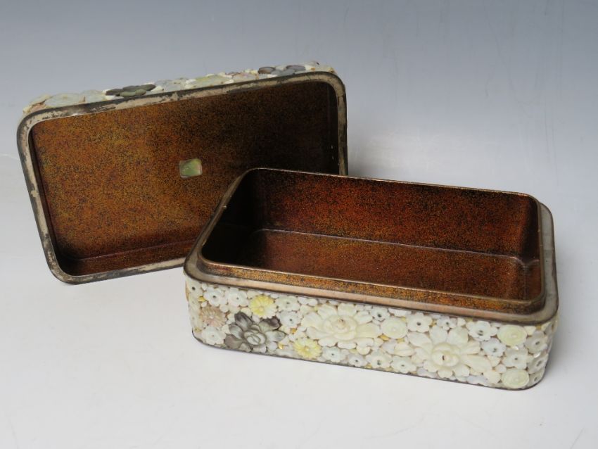 A DECORATIVE ORIENTAL LACQUER WARE LIDDED BOX, with extensive mother of pearl floral embellishment, 15.5 x 9.5 x 6 cm S/D