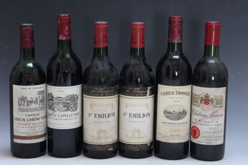 6 BOTTLES OF SAINT EMILION RED WINE CONSISTING OF 1 BOTTLE OF CHATEAU TRIMOULET SAINT EMILION GRAND CRU CLASSE 1994 -VERY TOP SHOULDER, 1 bottle of Chateau Jauma 1971 - mid shoulder, 1 bottle Chateau Lapelletrie Grand Cru, 2 bottles La Bergerieba Baron Philippe De Rothschild St Emilion NV - both just in neck, and 1 bottle of Chateau Vieux Chene Vert 1983