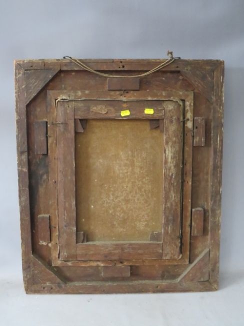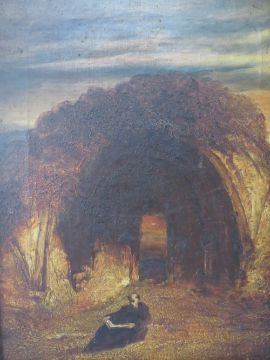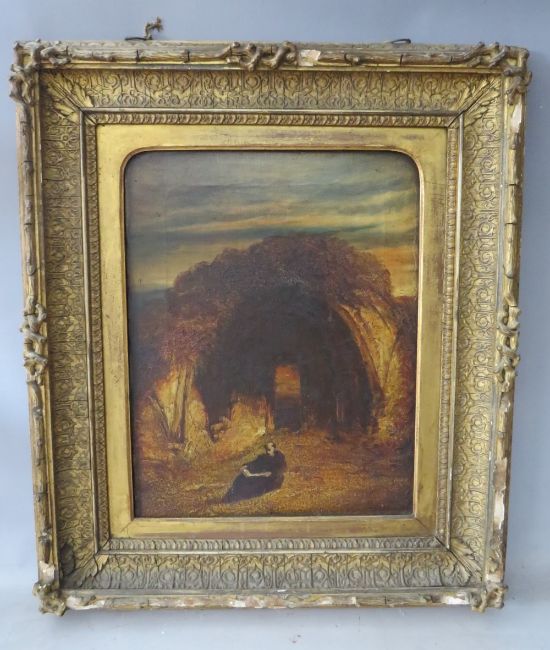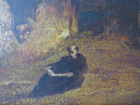 (XVIII-XIX). Continental school, twilight landscape with monk reading before a ruined arch, unsigned, oil on canvas, framed, 44 x 34 cm