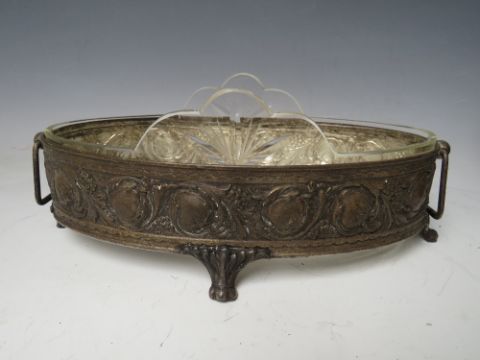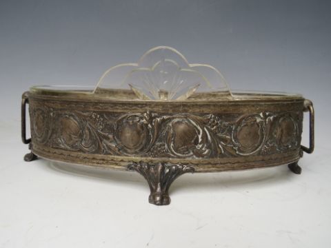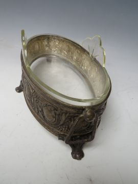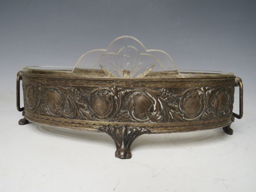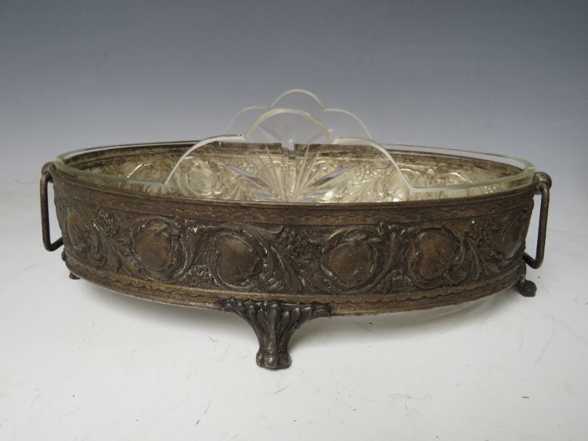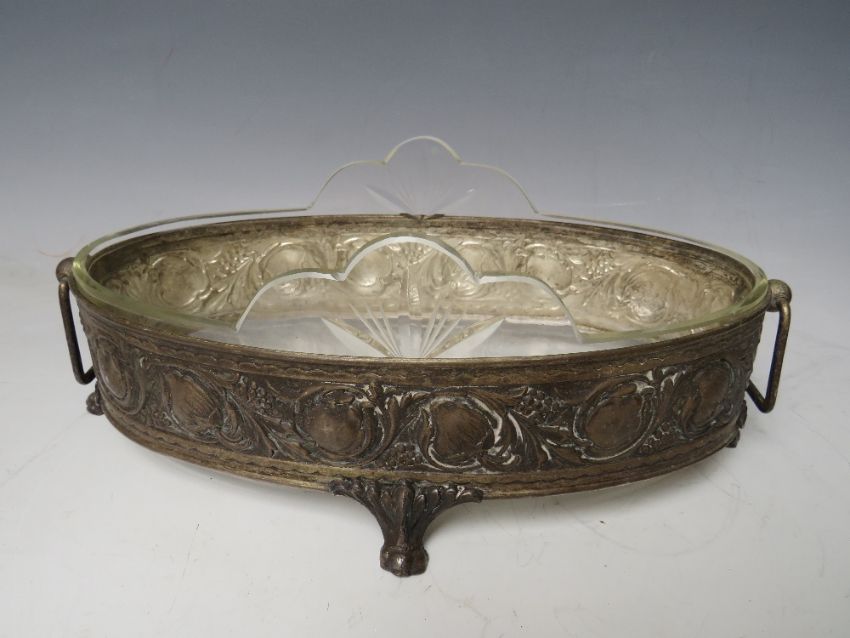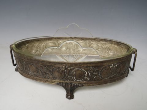 AN ART NOUVEAU OVAL WHITE METAL JARDINIAIRE WITH GLASS LINER, W 26.5 cm
