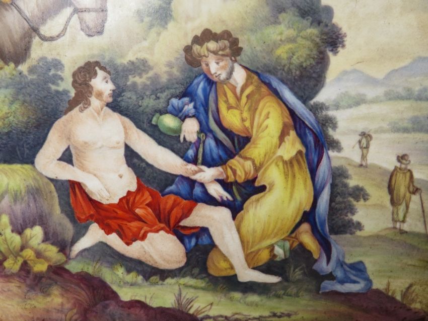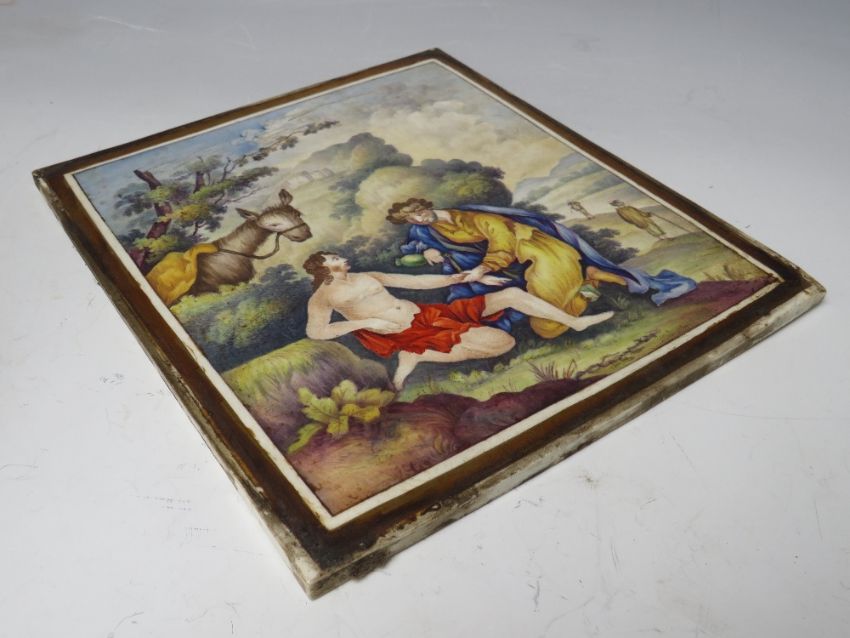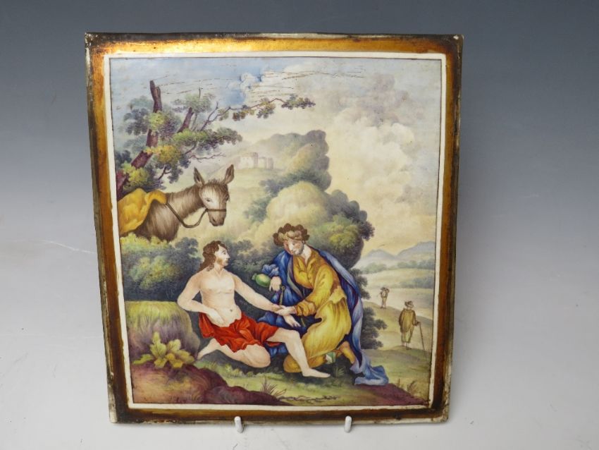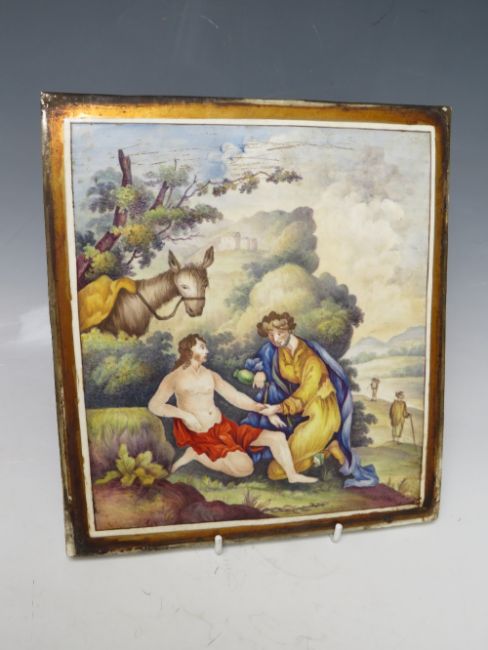 AN 18TH CENTURY PORCELAIN PLAQUE DEPICTING FIGURES, gilt banding, 23.5 x 21.5 cm, S/D