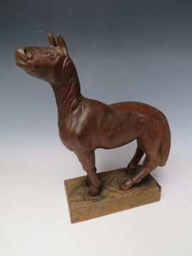 AN EARLY 20TH CENTURY NAIVE WOODEN CARVING OF A HORSE, on a rectangular wooden plinth, Overall H 33 cm, W 25 cm