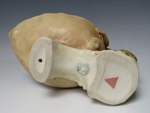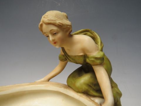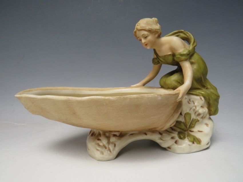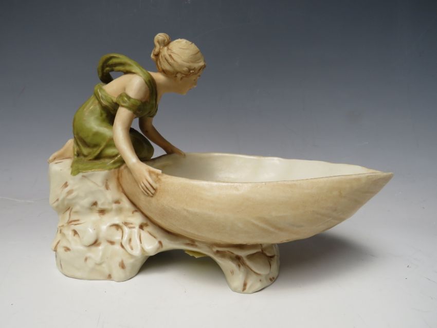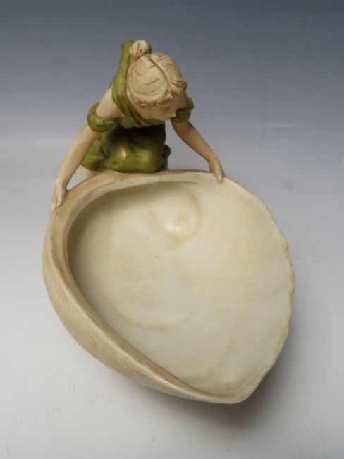 A ROYAL DUX FIGURE MODELLED AS A LADY HOLDING A SHELL, marks to base 1747 with pink triangle, W 22 cm, W 12 cm, H 10.5 cm