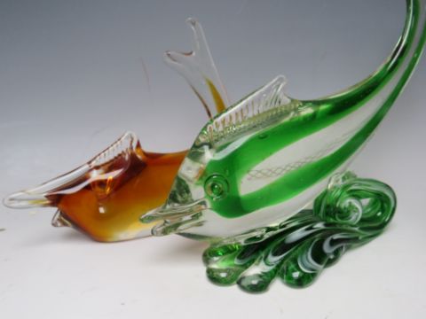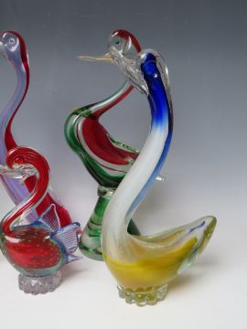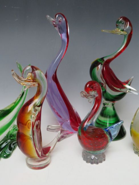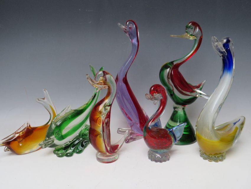 A COLLECTION OF MURANO AND STUDIO GLASS DUCK FIGURES, tallest H 32 cm, together with two studio glass figures of fish (7)