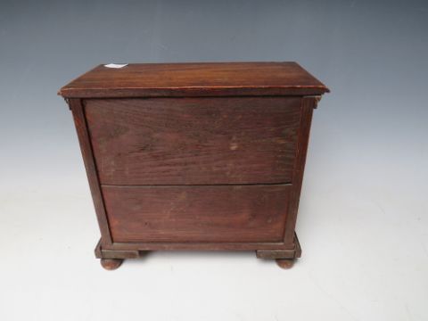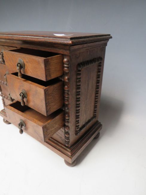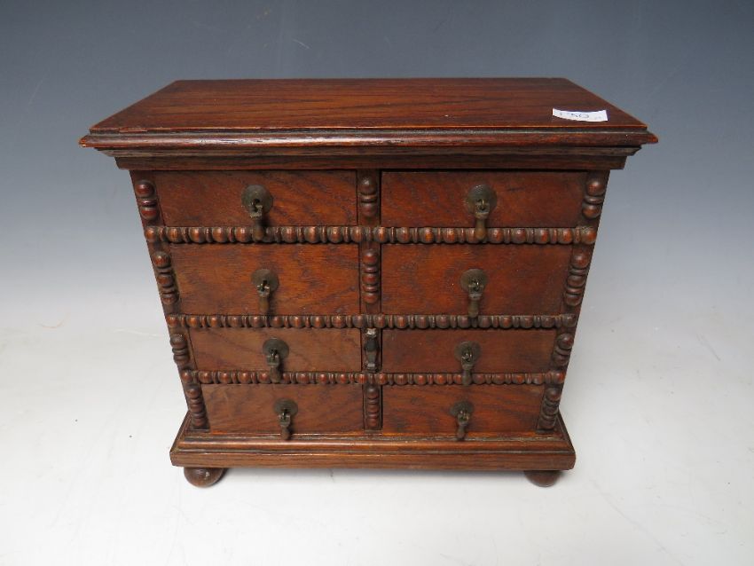 A VICTORIAN MINIATURE OAK COLLECTORS CHEST OF EIGHT DRAWERS, with beadwork detail, raised on bun feet, H 23 cm, W 24.5 cm
