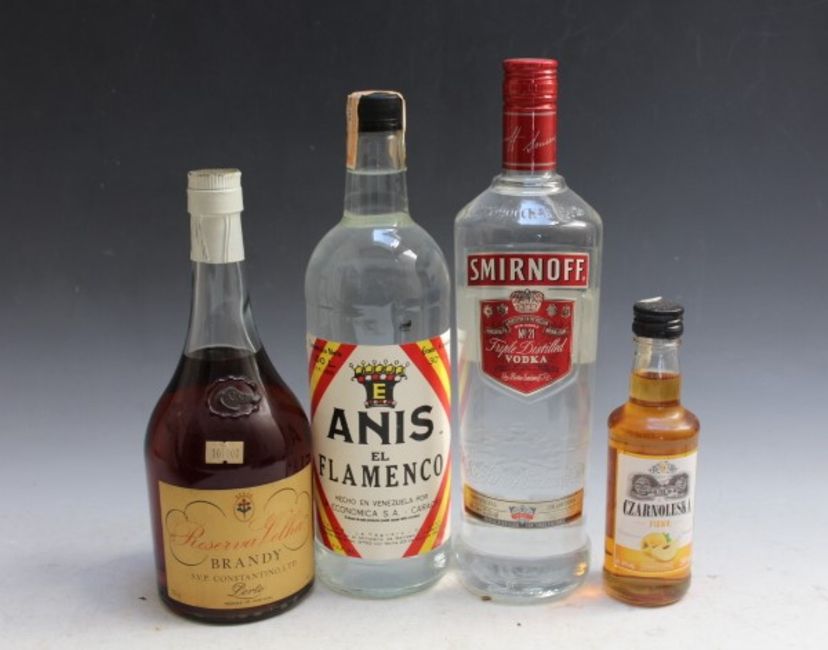 1 BOTTLE OF PORTUGUESE RESERVA VELHA BRANDY BY CONSTANTINO LTD, together with 1 litre bottle of anis el flamenco, 1 litre bottle of Smirnoff Vodka and a 200ml bottle of Czarnoleska Pigwa (4)