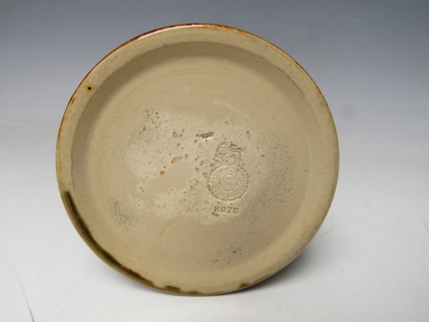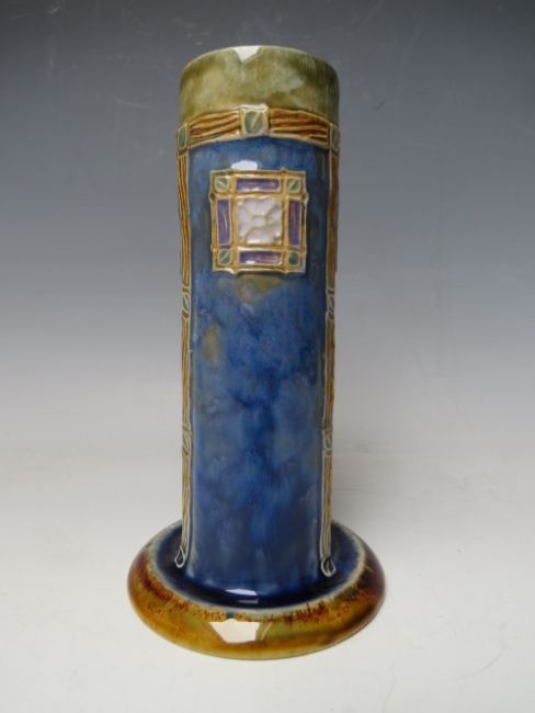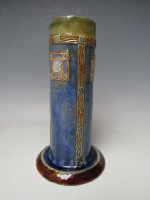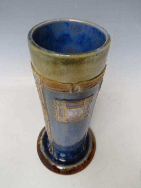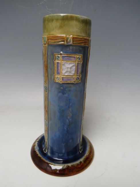 A ROYAL DOULTON STONEWARE GLAZED POTTERY CYLINDRICAL FOOTED VASE, impressed mark to base, approx H 19 cm
