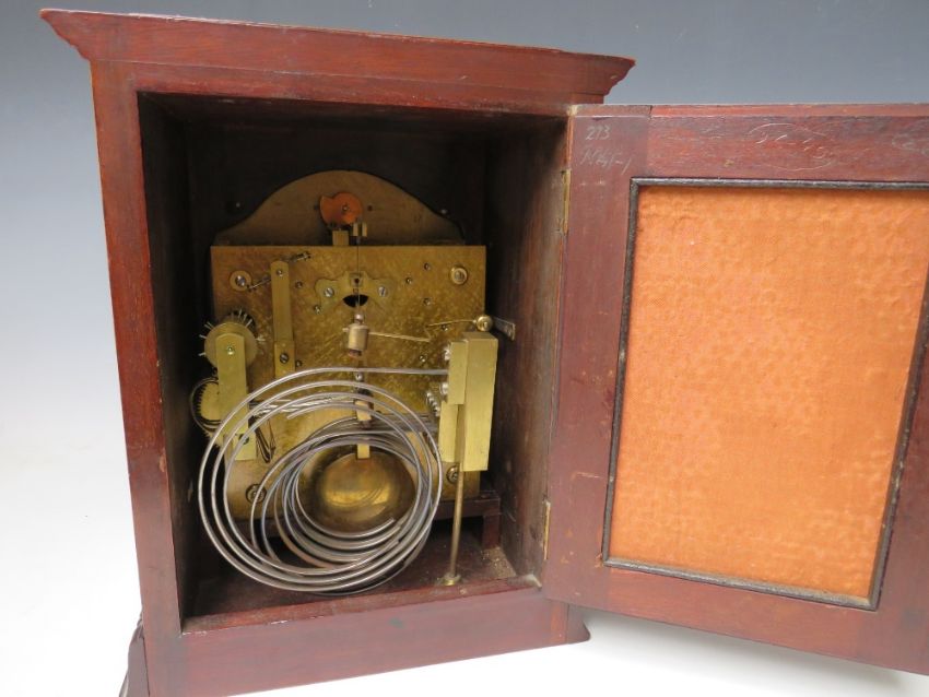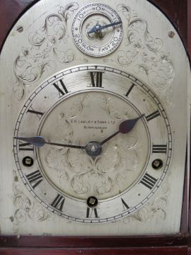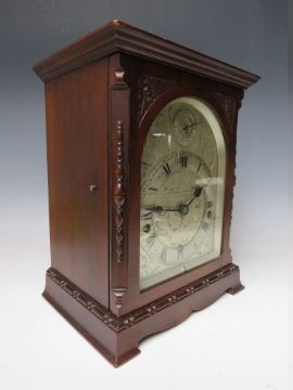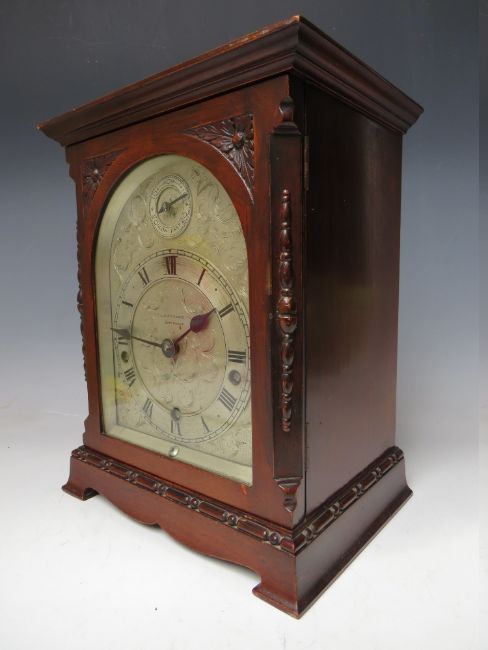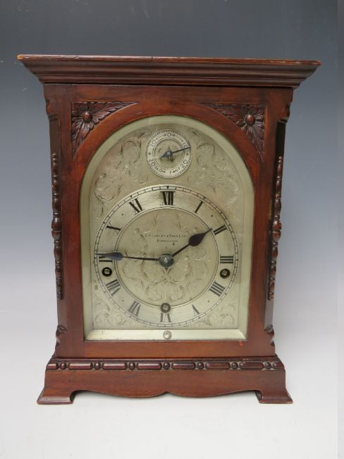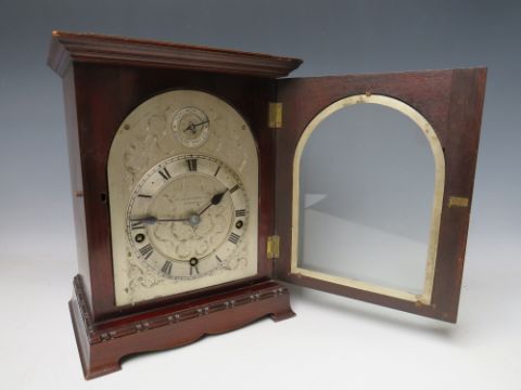 A MAHOGANY CASED J.J. ELLIOTT WESTMINSTER CHIME MANTLE CLOCK, retailed by E.H. Lawley & Sons Ltd., Birmingham, the silvered dial with Roman numerals and subsidiary slow / fast dial above, quarter chiming, with pendulum, H 28 cm
