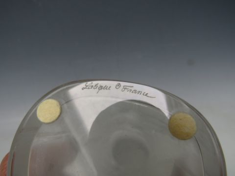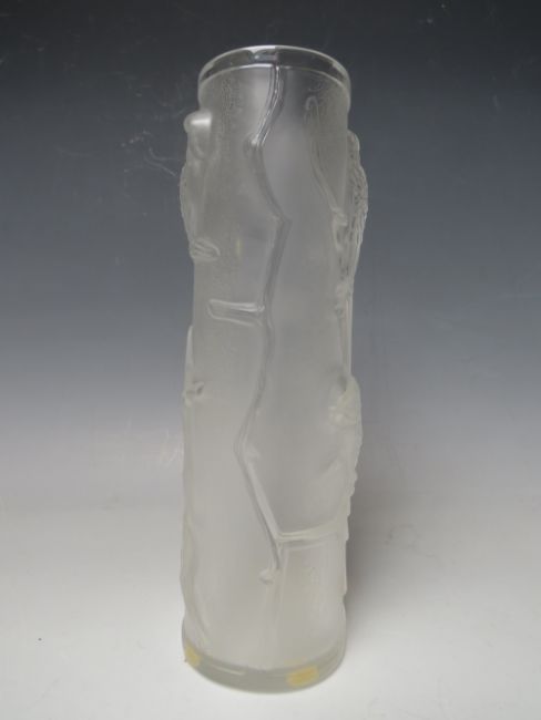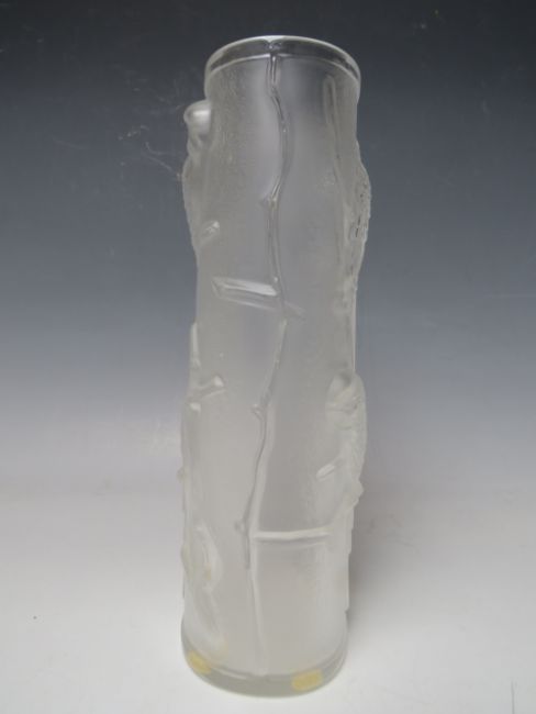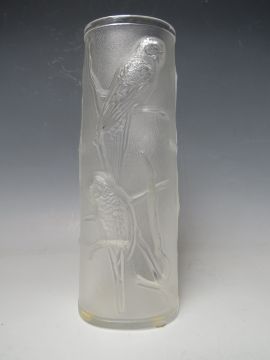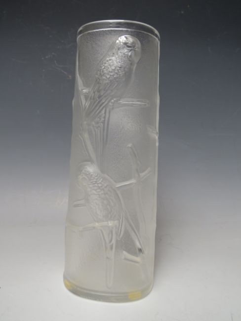 A LALIQUE BUDGERIGAR PATTERN FROSTED GLASS VASE WITH RAISED DECORATION, signed 'Lalique France' to the base, approximate H 21.5 cm
