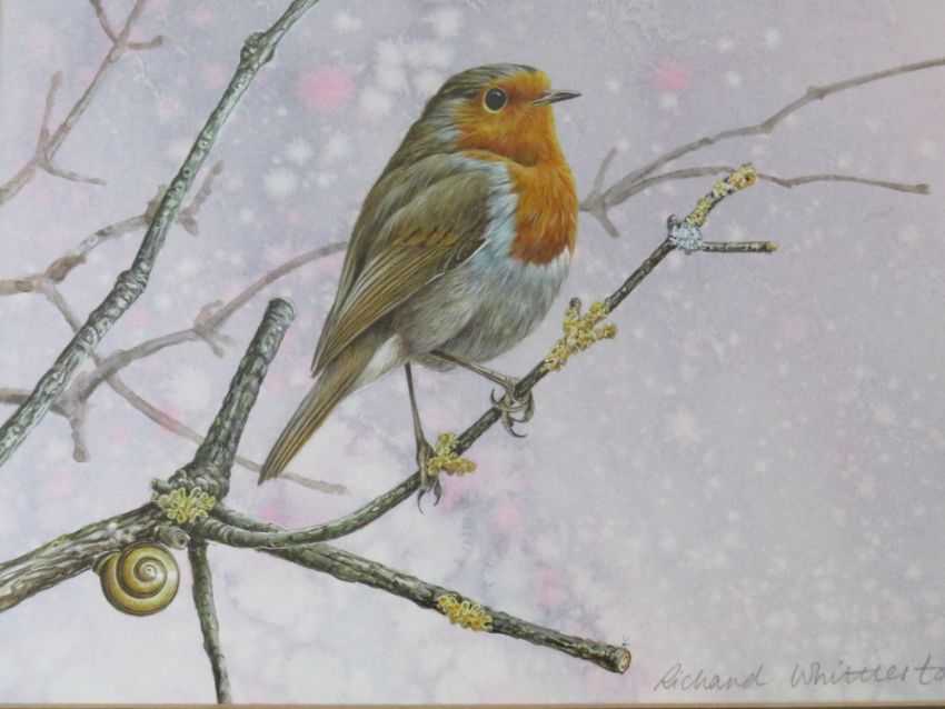 RICHARD WHITTLESTONE (XX). British school, study of a robin perched on a branch, signed lower right, watercolour and gouache on paper, framed and glazed, 17 x 23 cm