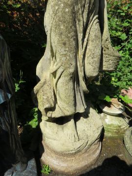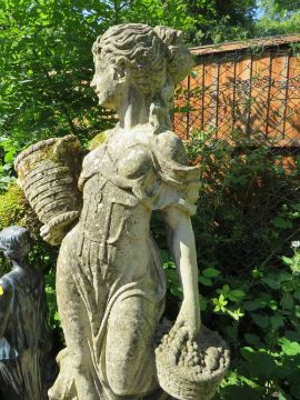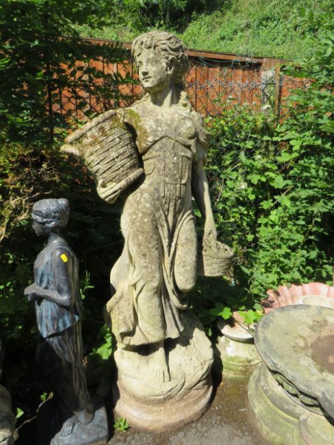 A LARGE 20TH CENTURY STONE FEMALE GARDEN STATUE, with an urn in one hand and a basket of fruit in the other, H 139 cm
