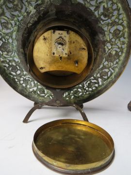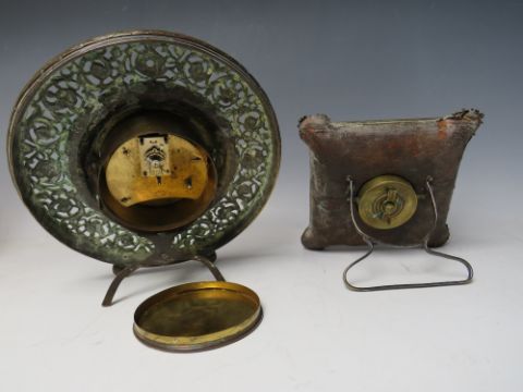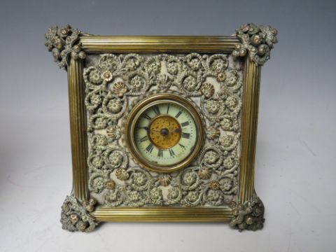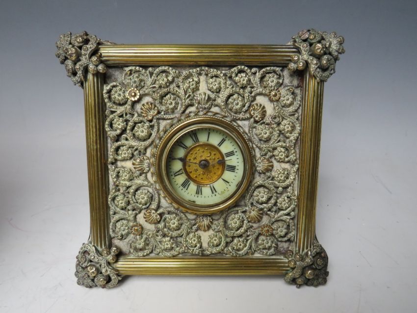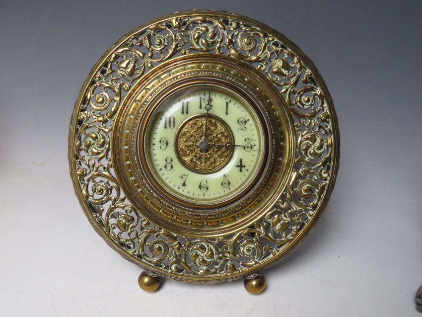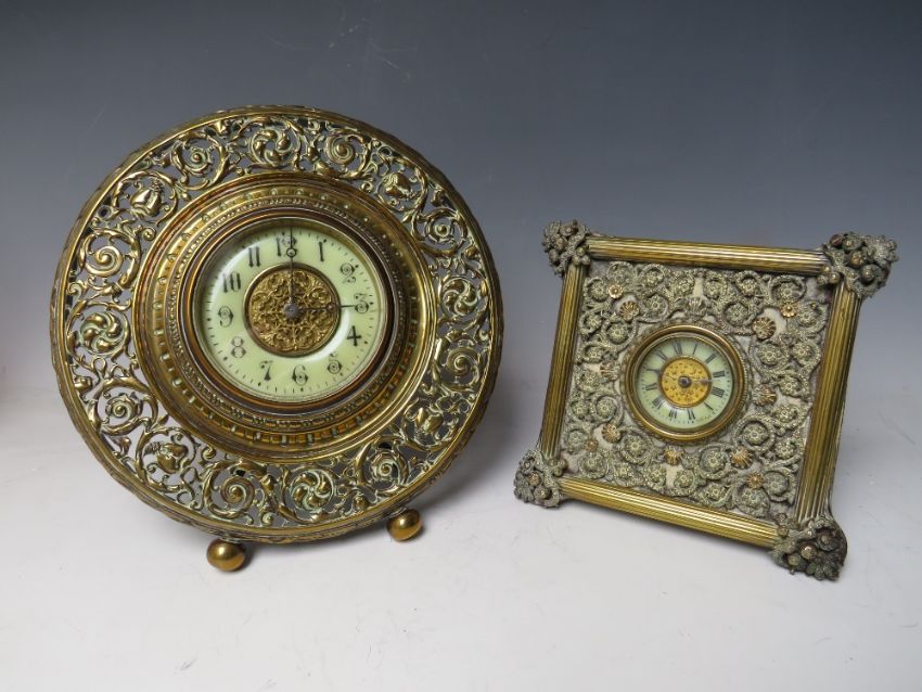 A LATE 19TH /EARLY 20TH CENTURY FRENCH BRASS EASEL BACK MANTEL CLOCK WITH PIERCED DECORATION, the circular dial set with Arabic numerals, the movement stamped R & Co. Paris, H 24 cm, together with a similar smaller English example (2)
