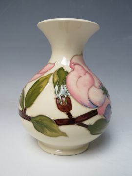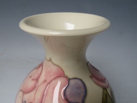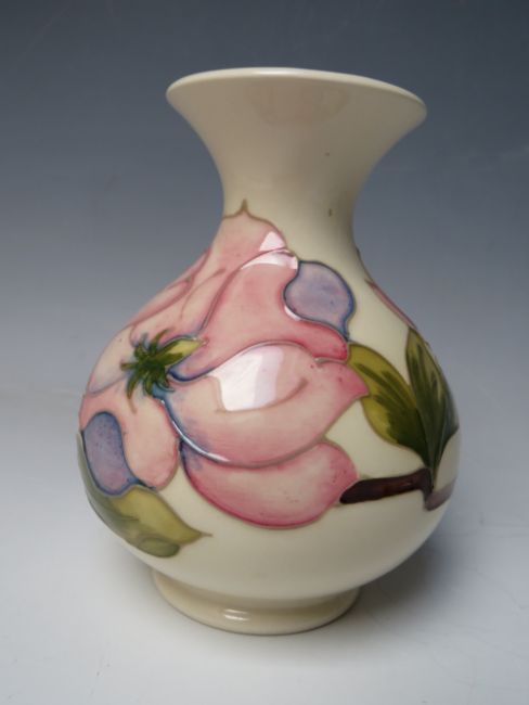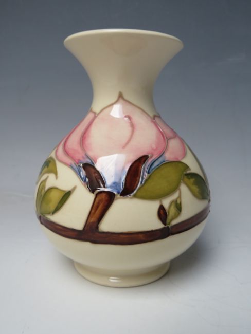 A MOORCROFT PINK MAGNOLIA PATTERN VASE, of bulbous for with flared rim, impressed and painted marks to underside, H 13.2 cm