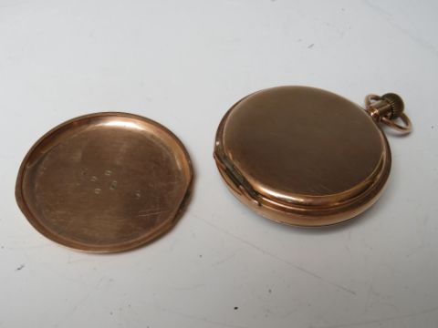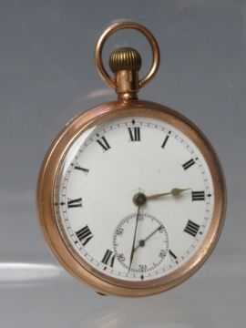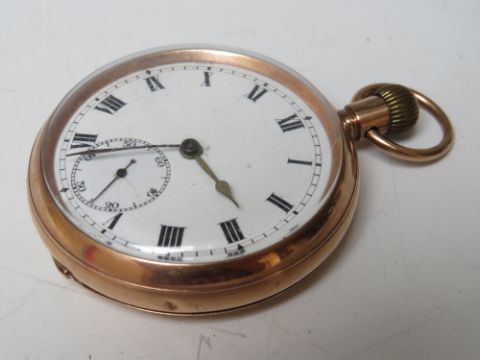 A 9CT GOLD CASED POCKET WATCH, the enamel dial having Roman numerals, outer minute markers and subsidiary seconds dial, engraved initials to back panel of case