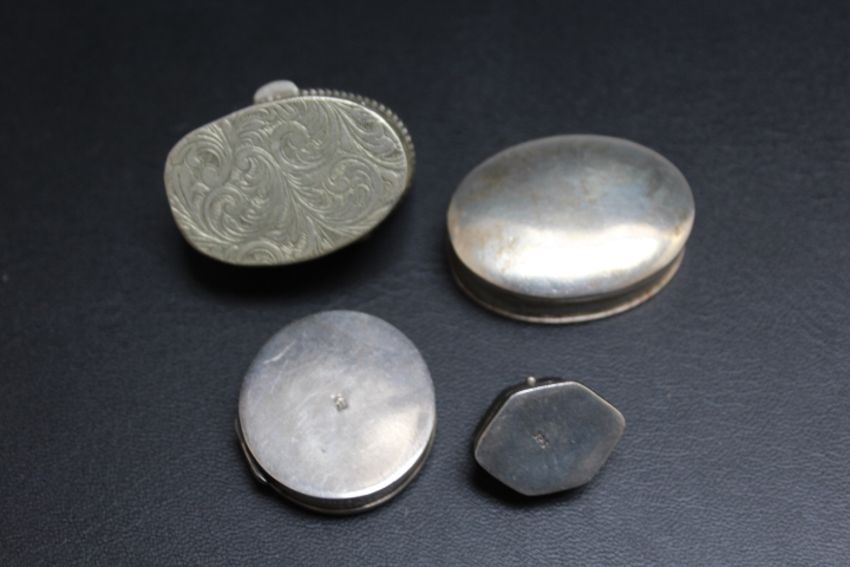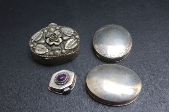 A COLLECTION OF FOUR SILVER AND WHITE METAL PILL BOXES