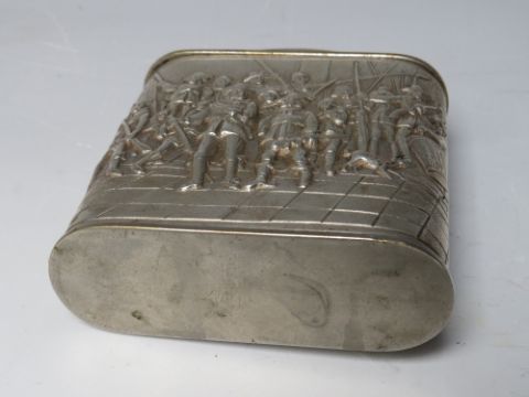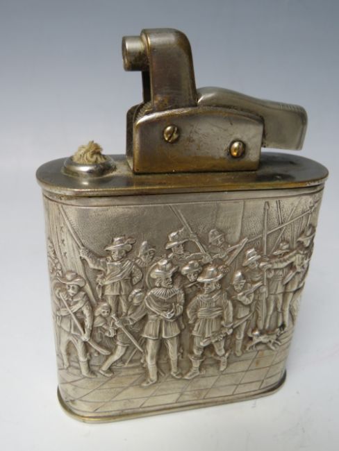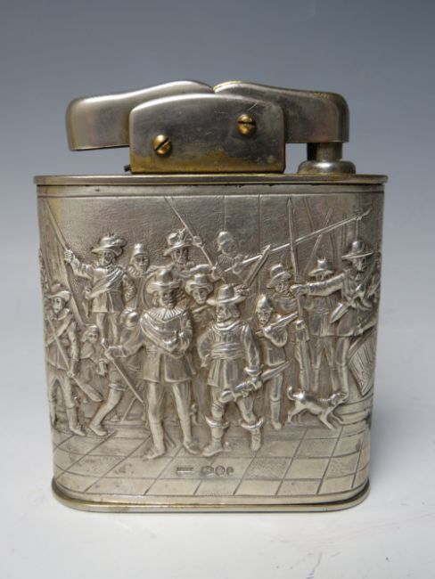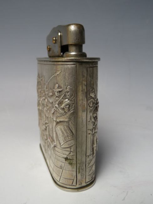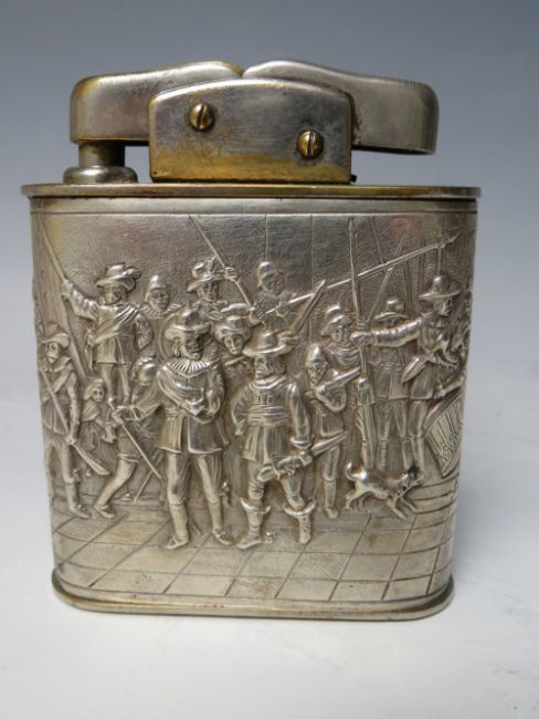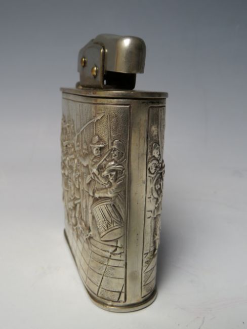 SILVER CASED TABLE LIGHTER WITH EMBOSSED SCENES OF CAVALIER SOLDIERS, with Amsterdam assay marks, H 10 cm