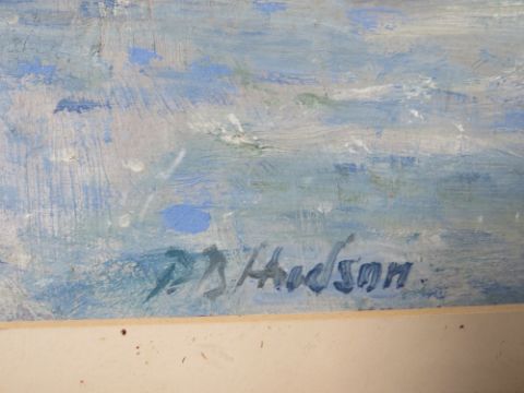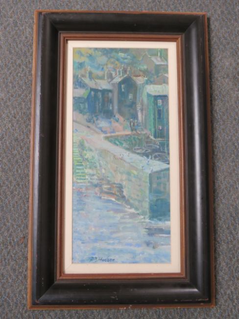 P.B. HUDSON (XX). English school, coastal village harbour scene with boats and figures, signed lower left, oil on board, framed and glazed, 45 x 20 cm