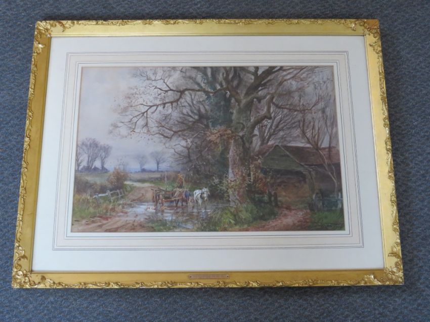 HENRY CHARLES FOX (1860-1925). A rural wooded landscape with horses, cart and figures crossing a stream, signed and dated 1916 lower right, watercolour, framed and glazed, 34 x 53 cm