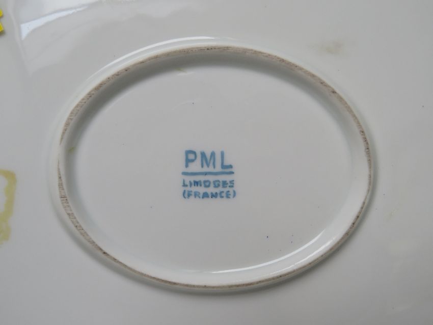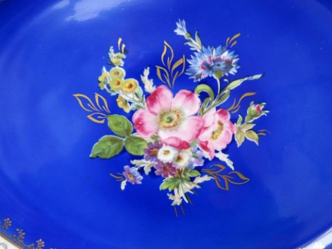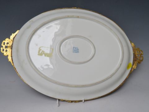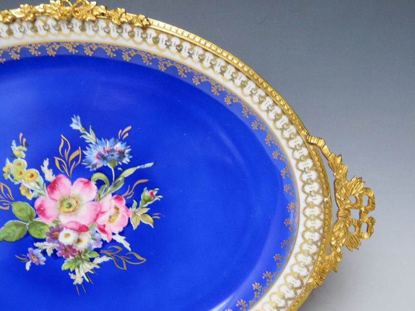 A 20TH CENTURY LIMOGES OVAL PORCELAIN PLATTER, with central floral painted detail on a deep blue ground, gilt mounts, W 42 cm