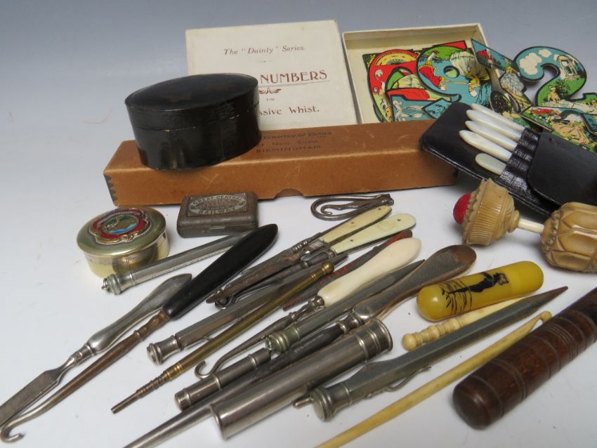 A COLLECTORS LOT - to include a 'Great Central Railway Hotel match strike, lacquer ware box, sewing implements, button hooks , propelling pencils, The 'Dainty Series Table Numbers for Progressive Whist etc.